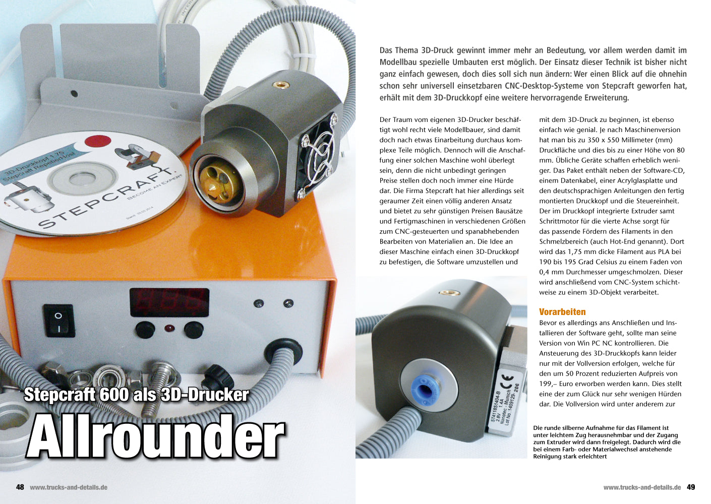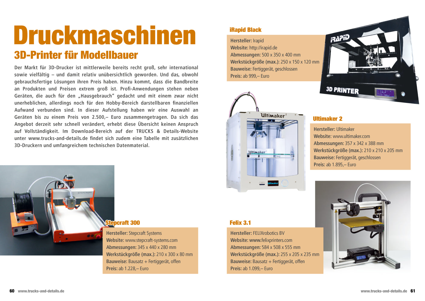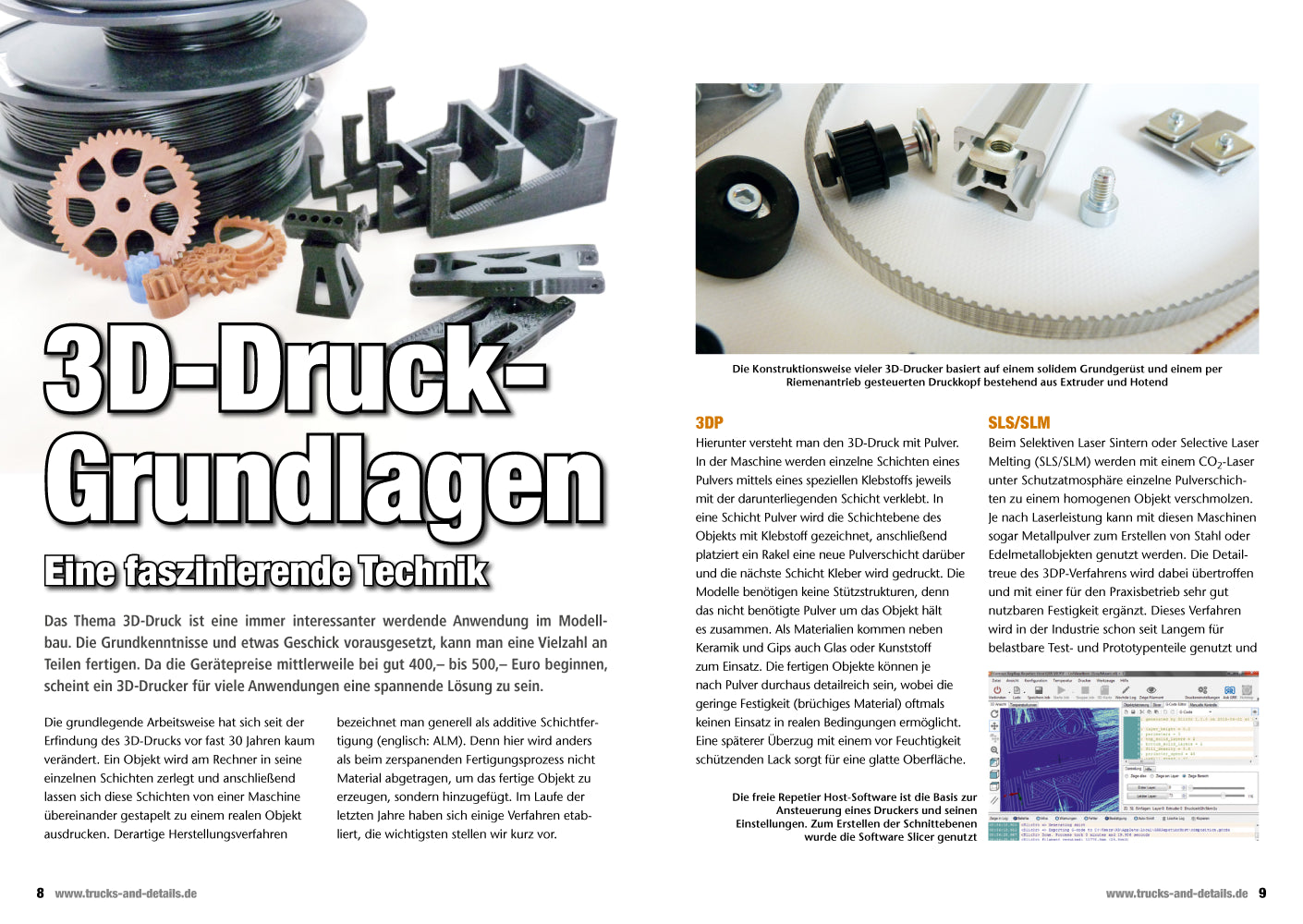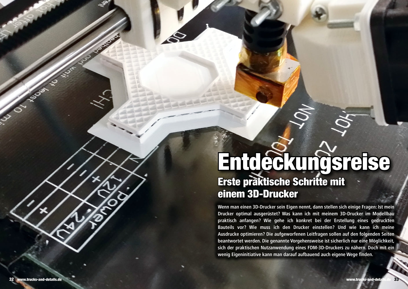 Noch vor gar nicht so langer Zeit schien es sich um Science Fiction zu handeln, wenn man darüber nachdachte, dass wie aus dem Nichts dreidimensionale Körper erschaffen werden könnten. Wie von Geisterhand, automatisch, hoch präzise. Doch was klingt wie aus dem Schurken-Labor eines James Bond-Bösewichts ist mittlerweile Realität. Und mehr noch. Es ist für jedermann machbar. Die 3D-Druck-Technologie gehört zu den bemerkenswertesten technischen Innovationen, die in den letzten Jahren Einzug in den Modellbau gehalten haben. Und wie viele Neuentwicklungen zuvor, brauchte auch der 3D-Druck eine Weile, ehe er den Sprung von der Spezialanwendung hin zur Massentauglichkeit schaffte. Zwar ist das Ganze auch heutzutage natürlich noch kein Schnäppchen, doch man kann mittlerweile mit zumindest überschaubarem finanziellen Aufwand in die faszinierende Technik einsteigen. Im aktuellen 3D-Druck workbook aus der TRUCKS & Details-Redaktion finden Interessierte alles, was man zum Start in diese Fertigungsmethode wissen muss: von Grundlagen und Basiswissen über konkrete Praxis-Tipps bis hin zur Vorstellung unterschiedlicher 3D-Drucker.