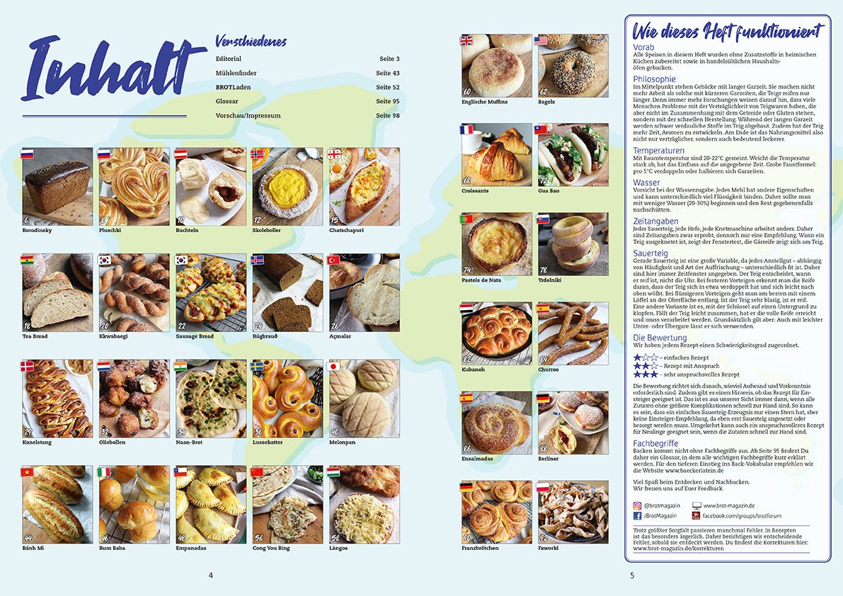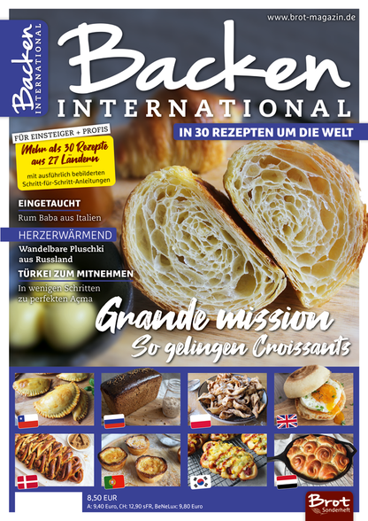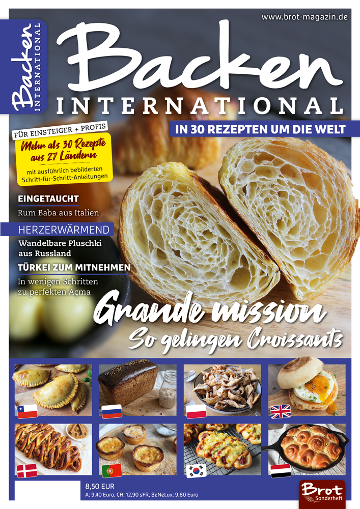 Backen International - In 30 Rezepten um die Welt lädt auf 100 Seiten ein zu einer kulinarischen Backreise rund um den Globus. Gelingsichere Rezepte aus 27 Ländern und umfangreiche Step-by- Step-Anleitungen in Wort und Bild machen das neue Sonderheft aus der BROT-Redaktion für unerfahrene Bäcker zu einer Fundgrube der Köstlichkeiten. Das Magazin bietet aber auch routinierten Bäckern Inspiration, Hintergrundwissen und jede Menge authentische Geschmackserlebnisse.
