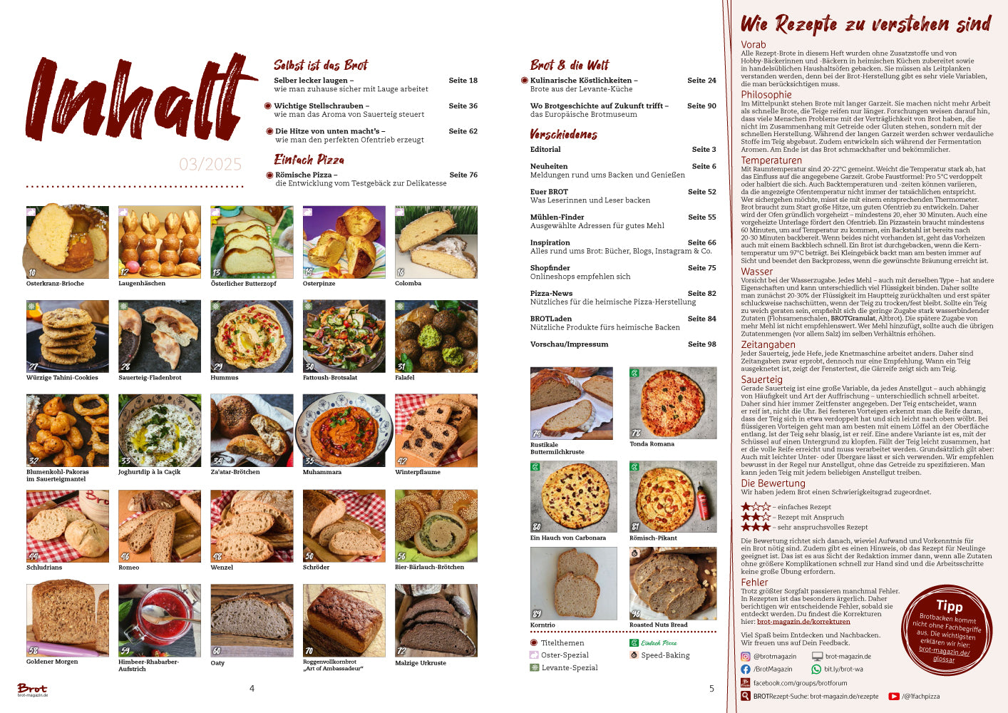 Gute Rohstoffe, ein paar richtige Handgriffe und dem Teig Zeit lassen - so entsteht perfektes Brot, aromatisch und bekömmlich. Brot, das schmeckt "wie früher" und das man ohne Magengrummeln isst. Die Zeitschrift BROT bringt alle zwei Monate mehr als 30 Rezepte für bekömmliche, kreative, schmackhafte und alltagstaugliche Brote. Darüber hinaus gibt es in jeder Ausgabe nützliche Informationen über Rohstoffe, Handgriffe, Triebmittel wie Hefe oder Sauerteig, die Prozesse in Teig und Ofen sowie Tipps und Tricks für das heimische Backen. Mit BROT wirst Du selbst Schritt für Schritt zur erfolgreichen Bäckerin, machst Familie, Freunde und Dich selbst mit aromatischen Broten glücklich. Darüber hinaus erzählen wir in jeder Ausgabe Geschichten über Menschen die von und mit Brot leben. Ob Getreidezüchter/in, Landwirt/in, Müller/in oder Bäcker/in - wir zeigen Menschen, die jeden Tag mit Leidenschaft für gutes Brot arbeiten.