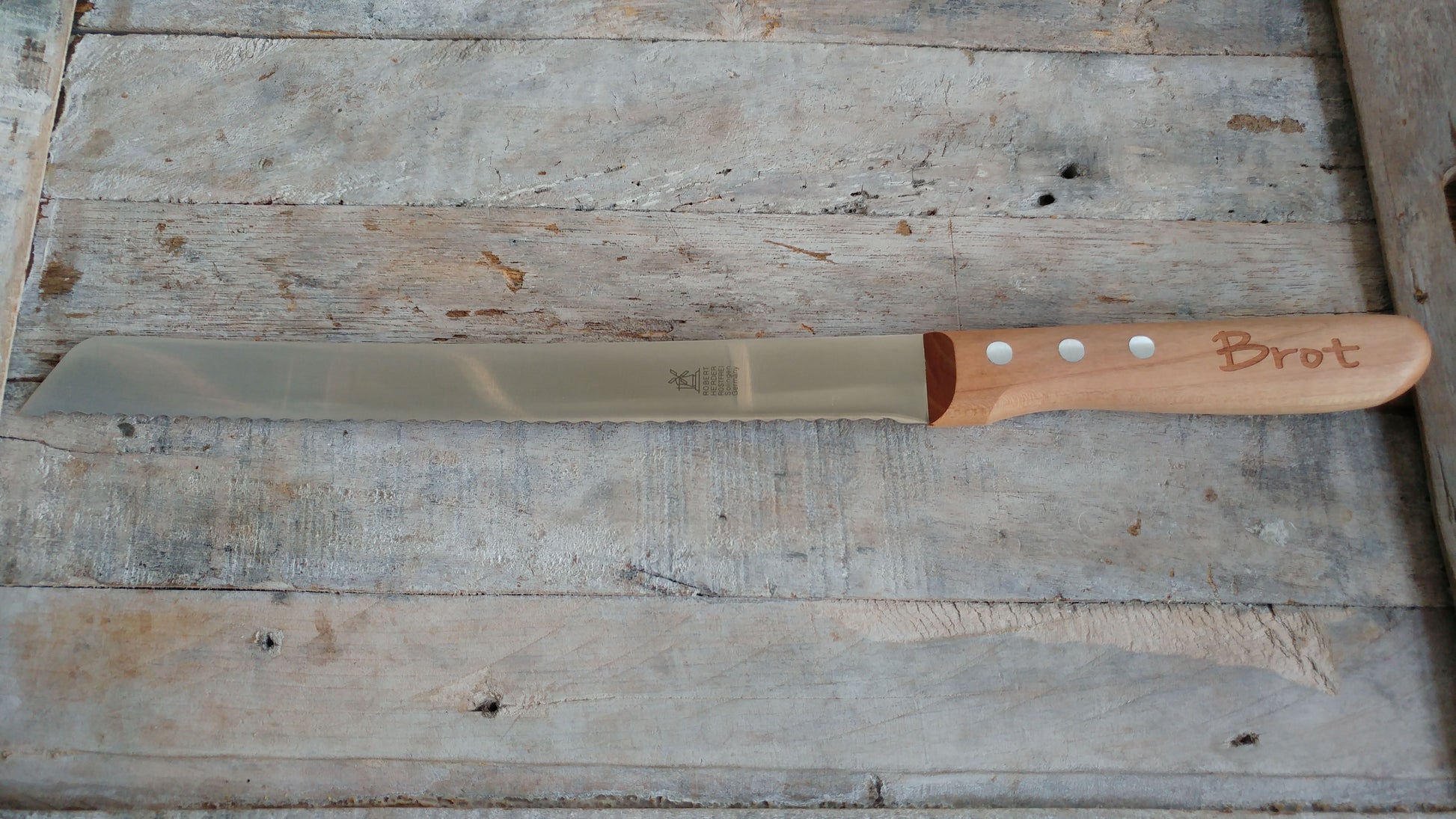 Mit einer Klingenlänge von 26 Zentimetern ist dieses wunderschöne Brotmesser der Marke Windmühle zum Schneiden von großen Landbroten geradezu wie geschaffen. Nutzt man diese Länge richtig aus, schneidet man eine Scheibe schon mit zwei, maximal drei Mal sägen vom Laib. Wie die meisten Windmühlen-Messers ist auch die Klinge vom „Ellenlang“ sorgsam von Hand blaugepließtet. Durch die so entstehende Glätte und Feinheit gleitet das Messer besonders leicht durch das Brot. Der Griff ist aus hochwertigem Kirschholz auf dem das BROT-Logo eingelasert ist.