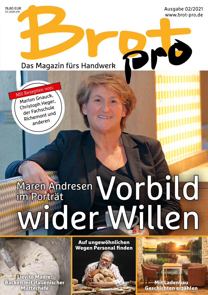 BROTpro ist das Magazin fürs Backhandwerk. Viermal jährlich dreht sich in diesem Magazin alles um gutes handwerkliches Brot. Wir erzählen Geschichten über alles, was gutes Brot ausmacht. Wir blicken in Backstuben rund um den Globus. Und wir verlieren dabei die Betriebswirtschaft nicht aus den Augen. Nicht zuletzt gibt es in jeder Ausgabe kreative Rezepte, die Kunden überzeugen und sich gut in den täglichen Arbeitsablauf integrieren lassen.