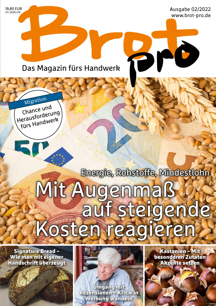 BROTpro ist das Magazin fürs Backhandwerk. Viermal jährlich dreht sich in diesem Magazin alles um gutes handwerkliches Brot. Wir erzählen Geschichten über alles, was gutes Brot ausmacht. Wir blicken in Backstuben rund um den Globus. Und wir verlieren dabei die Betriebswirtschaft nicht aus den Augen. Nicht zuletzt gibt es in jeder Ausgabe kreative Rezepte, die Kunden überzeugen und sich gut in den täglichen Arbeitsablauf integrieren lassen.