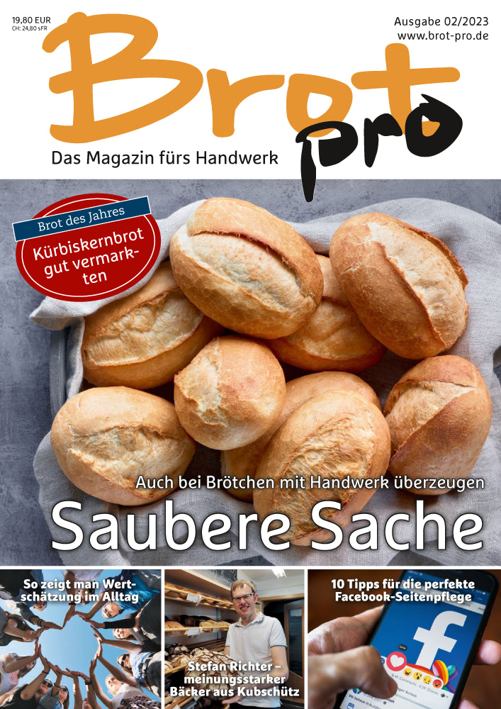 BROTpro ist das Magazin fürs Backhandwerk. Viermal jährlich dreht sich in diesem Magazin alles um gutes handwerkliches Brot. Wir erzählen Geschichten über alles, was gutes Brot ausmacht. Wir blicken in Backstuben rund um den Globus. Und wir verlieren dabei die Betriebswirtschaft nicht aus den Augen. Nicht zuletzt gibt es in jeder Ausgabe kreative Rezepte, die Kunden überzeugen und sich gut in den täglichen Arbeitsablauf integrieren lassen.