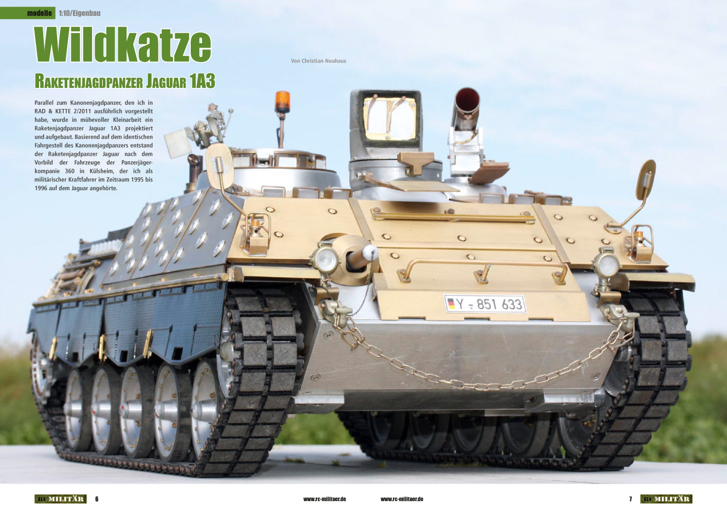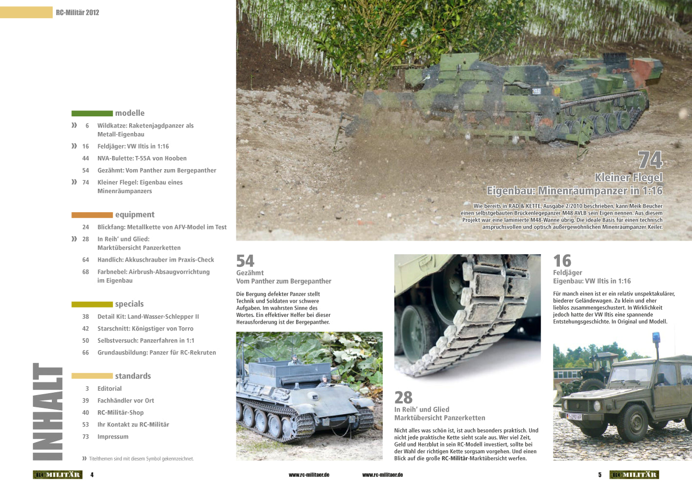 Die Anforderungen an Militär-Fahrzeuge sind komplex, ihre Funktionsvielfalt ist beeindruckend. Auch im Modellmaßstab. Eine raffinierte Technik sowie viele optische und akustische Effekte machen die vorbildgetreuen, ferngesteuerten Modelle zum absoluten Hingucker. Die perfekt nachgebildete Funktionalität sorgt für einen extrem hohen Unterhaltungsfaktor – bei Modellbauer und Publikum. Mit RC-Militär präsentiert die TRUCKS & Details-Redaktion ein Fachmagazin, das sich ausschließlich mit dem Funktionsmodellbau für militärische Spezialfahrzeuge beschäftigt.