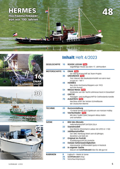 SchiffsModell berichtet neben den einzelnen Sparten der Schiffstypen wie Motorschiffe, Segelschiffe, Rennboote und Dampfschiffe auch über ergänzende Themen wie Fernsteuerungs- und Antriebstechnik, Akkus und Ladegeräte sowie Bearbeitungs- und Materialkunde. Regelmäßige Rubriken über Neuheiten am Markt, Tipps und Tricks sowie Nachrichten aus dem Vereinsleben informieren laufend über die aktuellen Themen aus der Szene. Aussagekräftige Testberichte über die unterschiedlichsten Produkte der Industrie sowie Reportagen über Veranstaltungen und Wettbewerbe runden das Magazin-Portfolio ab.
