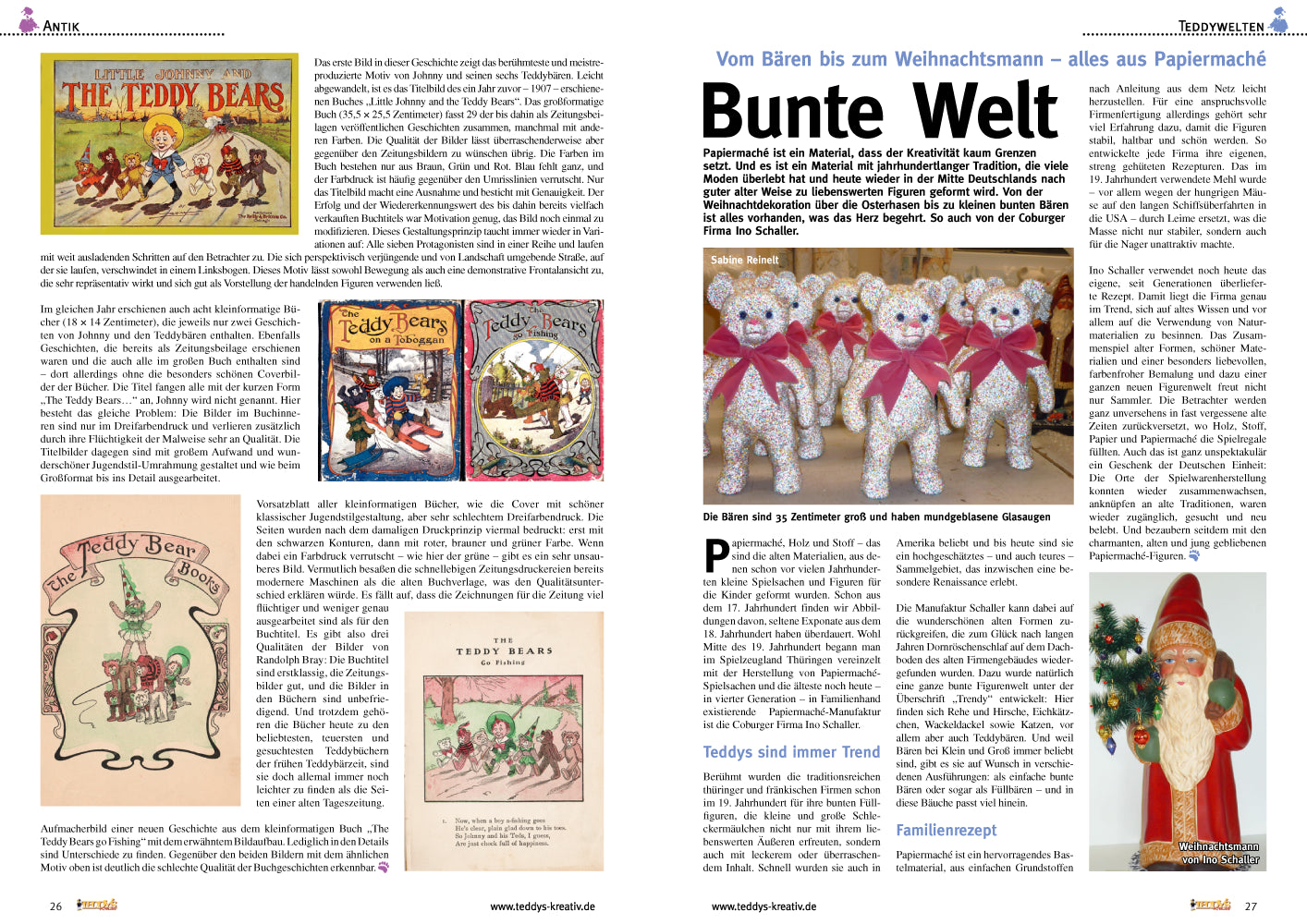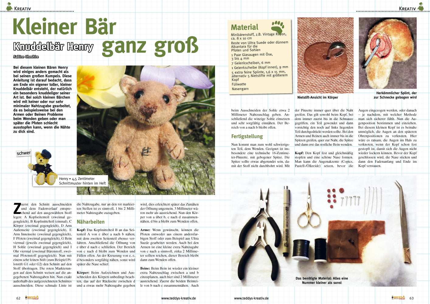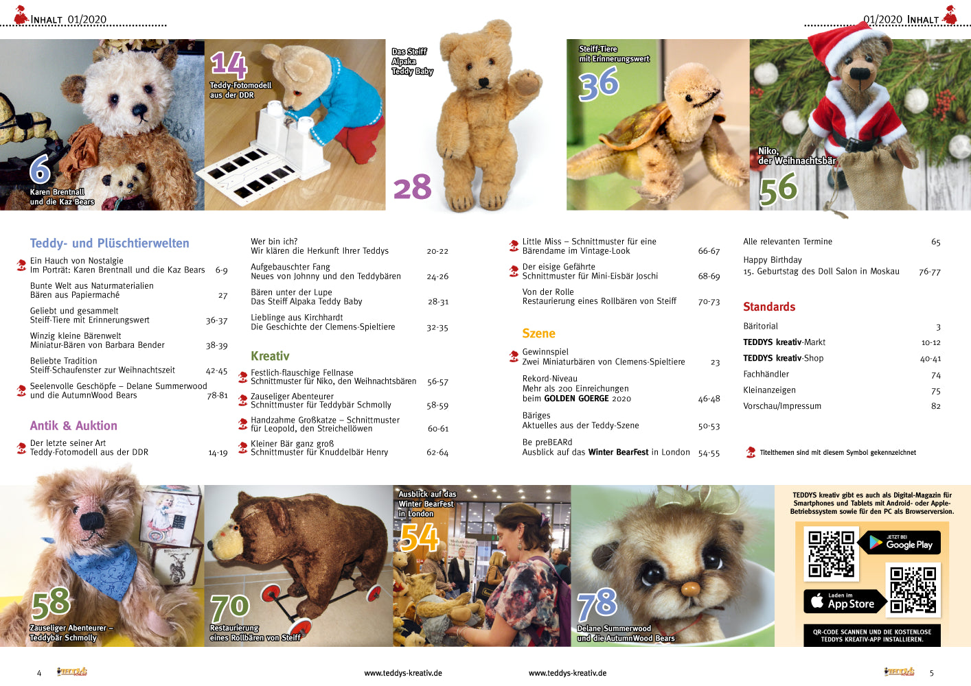 TEDDYS kreativ widmet sich allen Aspekten rund um Teddybären und Plüschtiere. Fundierte Informationen einerseits, liebenswerte Geschichten andererseits machen das Magazin zum unverzichtbaren Begleiter für Teddy-Liebhaber, -Sammler und -Künstler. Ein umfangreicher Kreativteil mit Nähanleitungen und Schnittbögen zum Nacharbeiten gehört zu jeder Ausgabe. Vervollständigt wird TEDDYS kreativ durch Profi-Tipps für Einsteiger und Fortgeschrittene sowie durch ausführliche Antik- und Auktionsberichte.