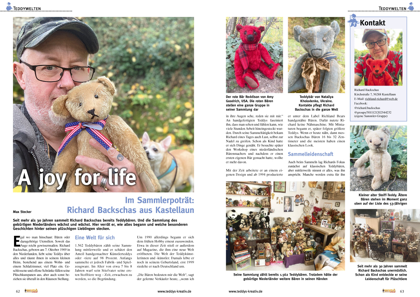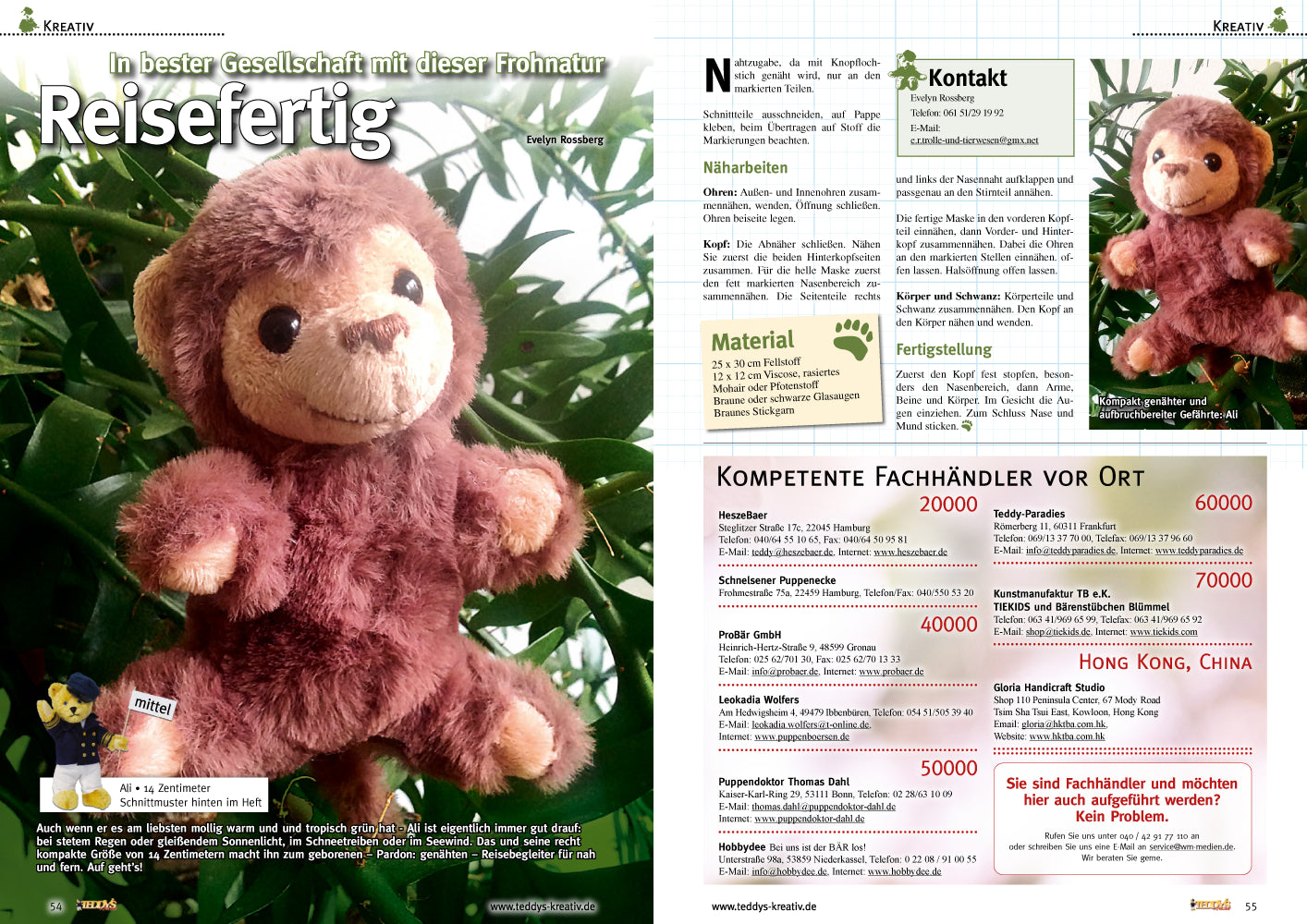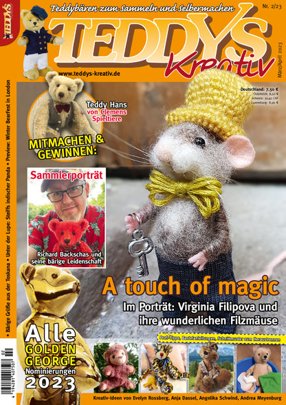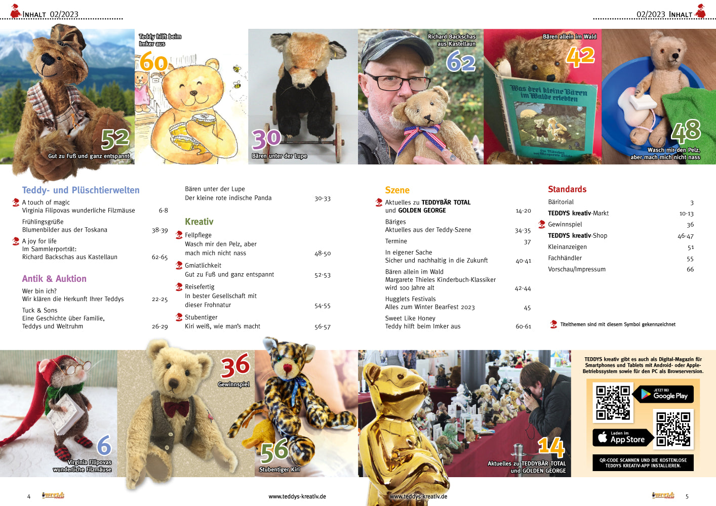 TEDDYS kreativ widmet sich allen Aspekten rund um Teddybären und Plüschtiere. Fundierte Informationen einerseits, liebenswerte Geschichten andererseits machen das Magazin zum unverzichtbaren Begleiter für Teddy-Liebhaber, -Sammler und -Künstler. Ein umfangreicher Kreativteil mit Nähanleitungen und Schnittbögen zum Nacharbeiten gehört zu jeder Ausgabe. Vervollständigt wird TEDDYS kreativ durch Profi-Tipps für Einsteiger und Fortgeschrittene sowie durch ausführliche Antik- und Auktionsberichte.
