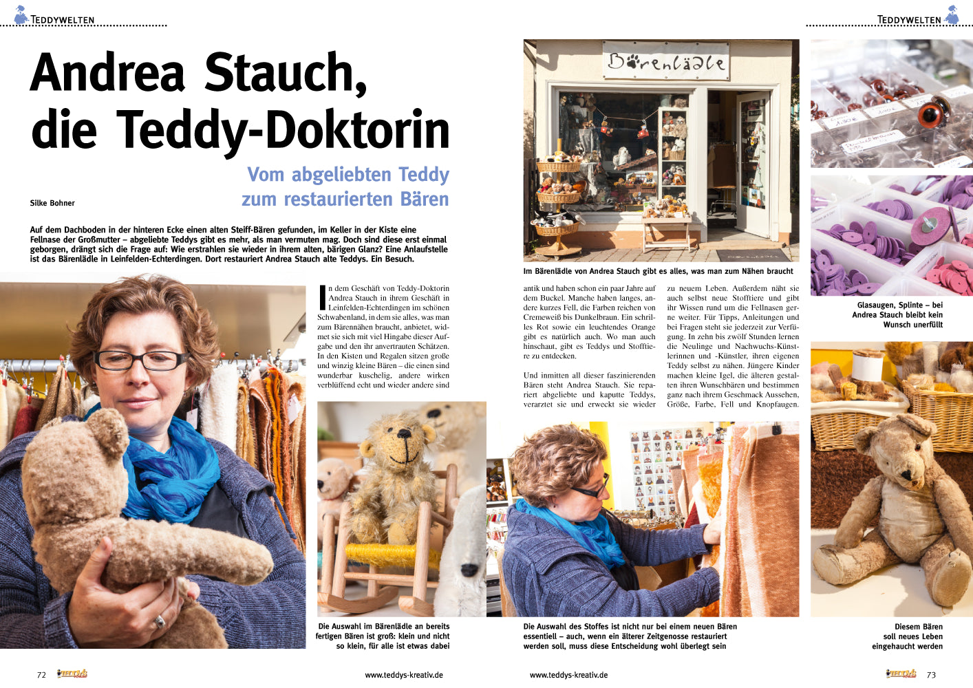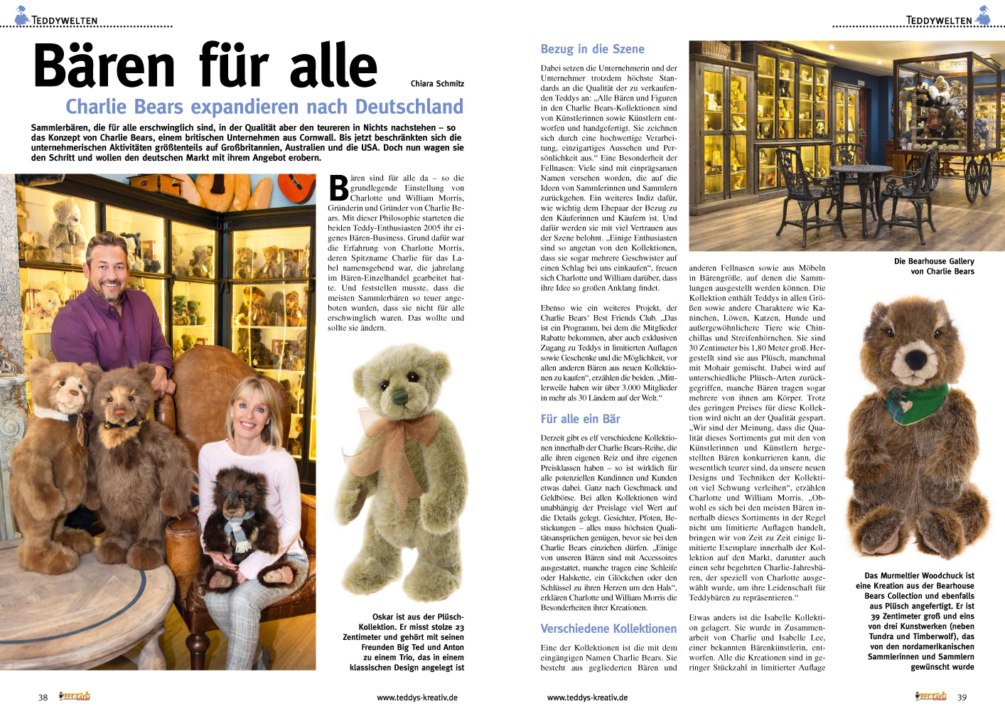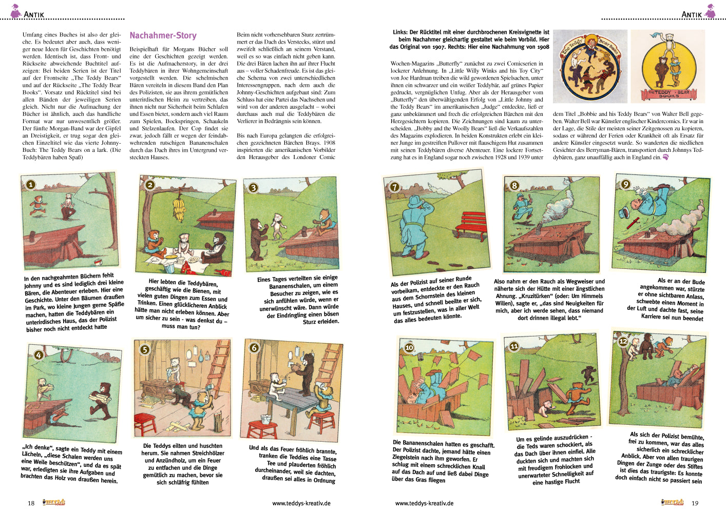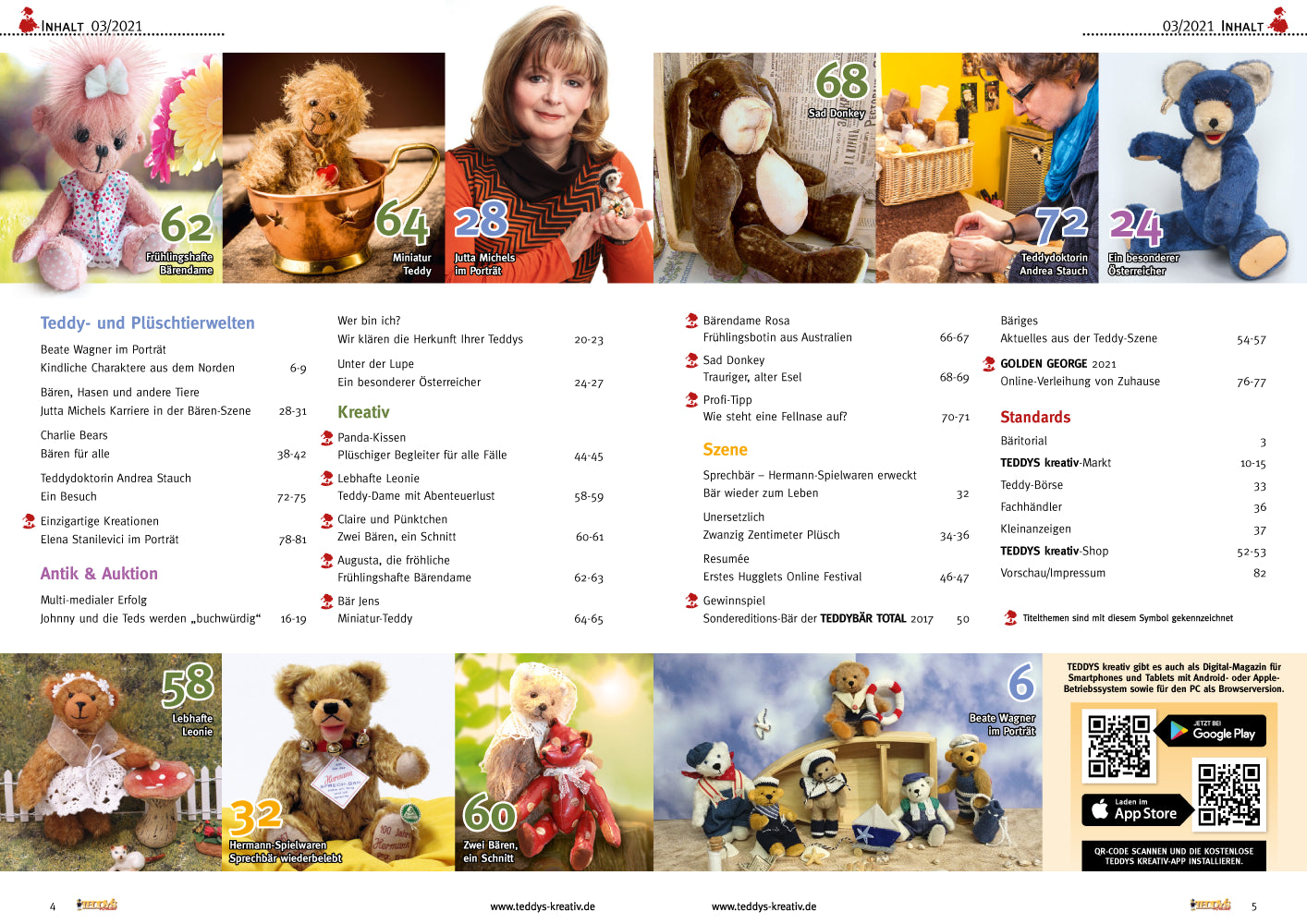 TEDDYS kreativ widmet sich allen Aspekten rund um Teddybären und Plüschtiere. Fundierte Informationen einerseits, liebenswerte Geschichten andererseits machen das Magazin zum unverzichtbaren Begleiter für Teddy-Liebhaber, -Sammler und -Künstler. Ein umfangreicher Kreativteil mit Nähanleitungen und Schnittbögen zum Nacharbeiten gehört zu jeder Ausgabe. Vervollständigt wird TEDDYS kreativ durch Profi-Tipps für Einsteiger und Fortgeschrittene sowie durch ausführliche Antik- und Auktionsberichte.