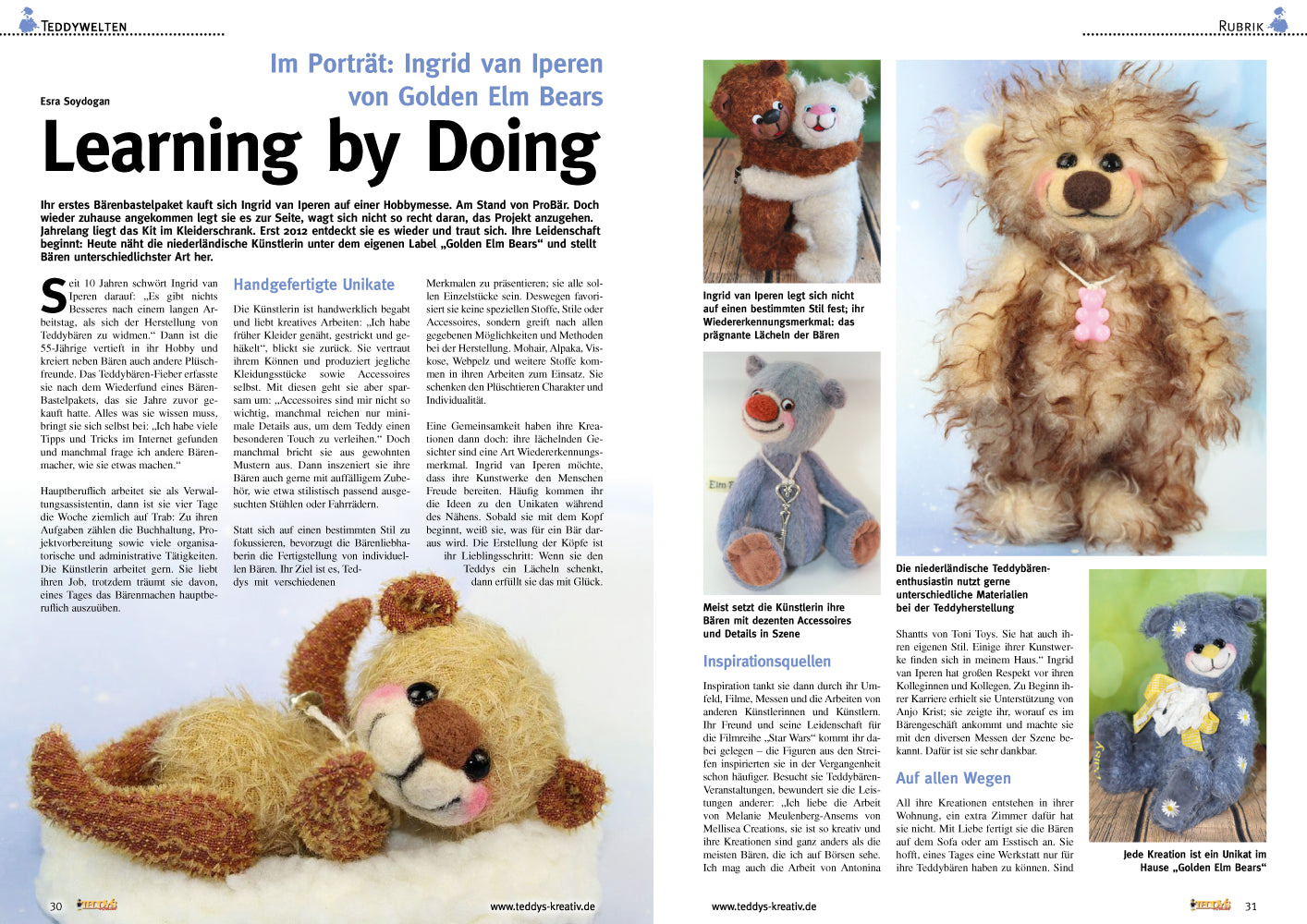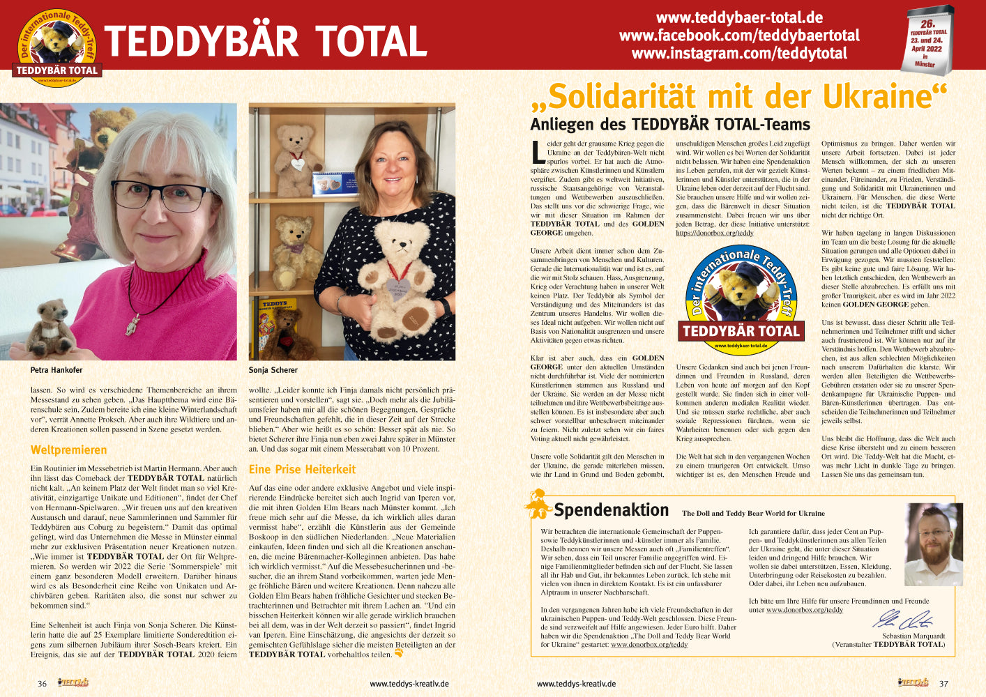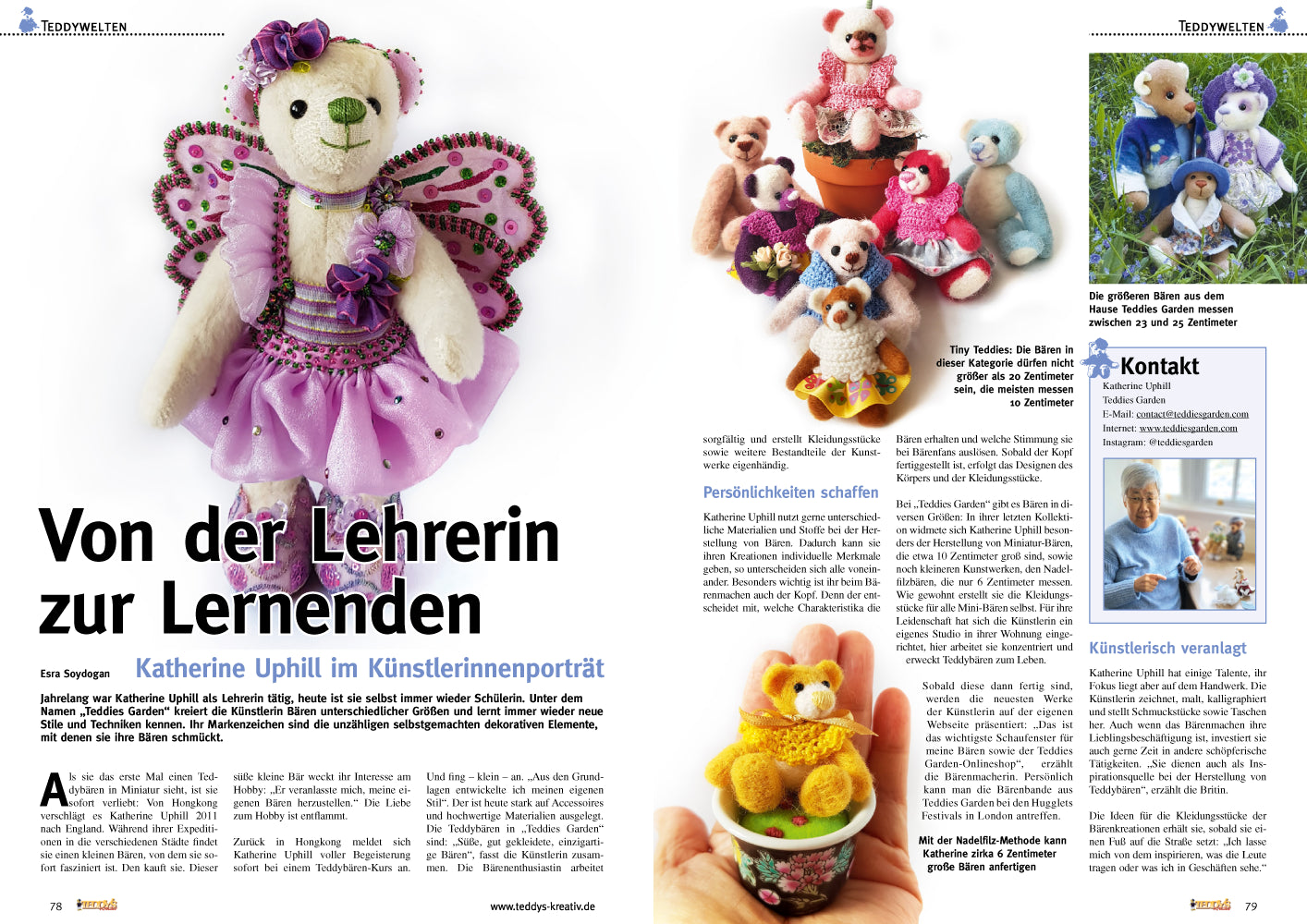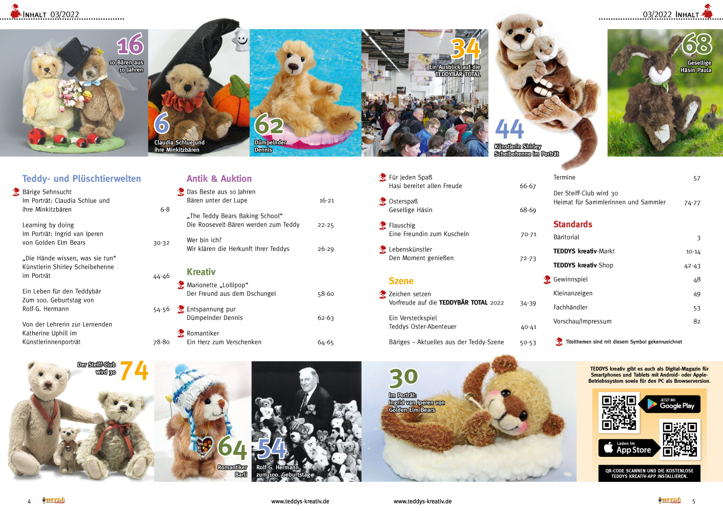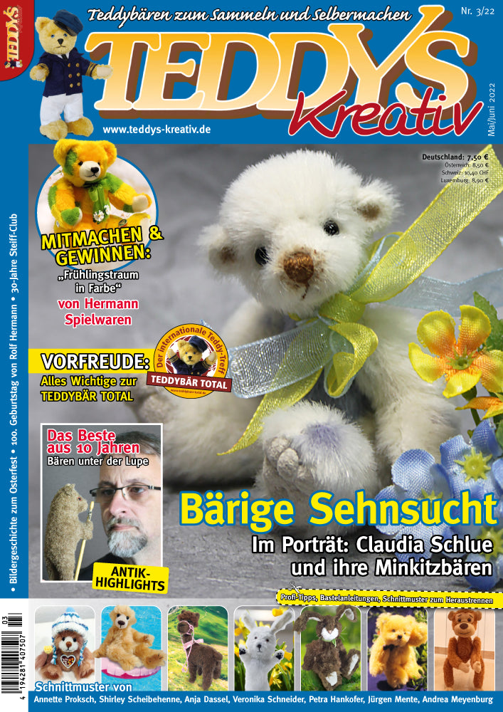 TEDDYS kreativ widmet sich allen Aspekten rund um Teddybären und Plüschtiere. Fundierte Informationen einerseits, liebenswerte Geschichten andererseits machen das Magazin zum unverzichtbaren Begleiter für Teddy-Liebhaber, -Sammler und -Künstler. Ein umfangreicher Kreativteil mit Nähanleitungen und Schnittbögen zum Nacharbeiten gehört zu jeder Ausgabe. Vervollständigt wird TEDDYS kreativ durch Profi-Tipps für Einsteiger und Fortgeschrittene sowie durch ausführliche Antik- und Auktionsberichte.