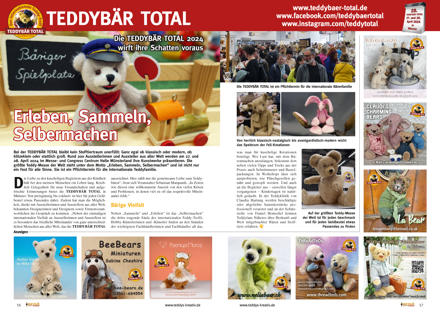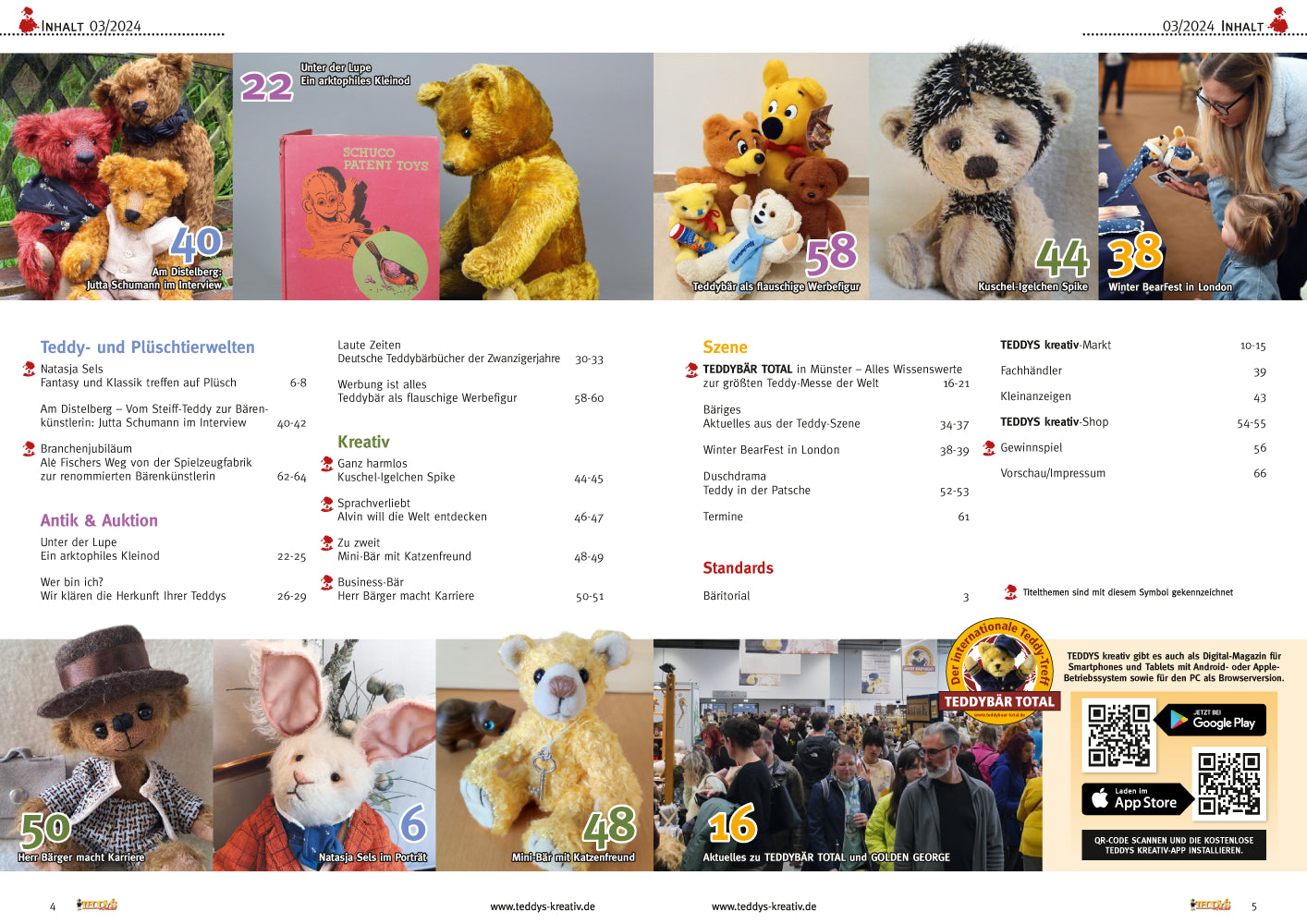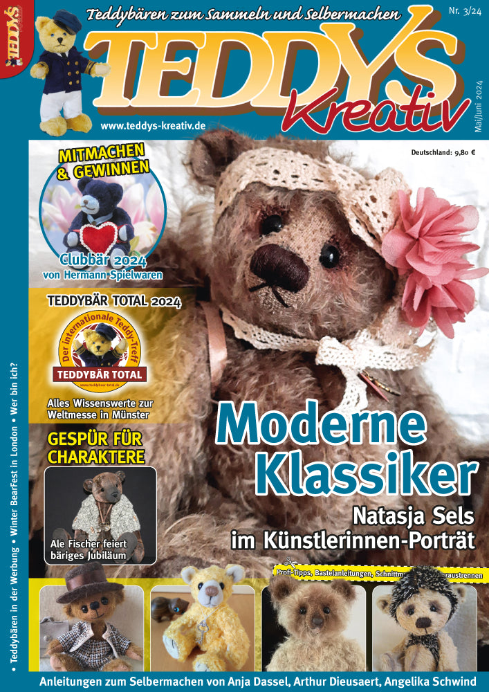 TEDDYS kreativ widmet sich allen Aspekten rund um Teddybären und Plüschtiere. Fundierte Informationen einerseits, liebenswerte Geschichten andererseits machen das Magazin zum unverzichtbaren Begleiter für Teddy-Liebhaber, -Sammler und -Künstler. Ein umfangreicher Kreativteil mit Nähanleitungen und Schnittbögen zum Nacharbeiten gehört zu jeder Ausgabe. Vervollständigt wird TEDDYS kreativ durch Profi-Tipps für Einsteiger und Fortgeschrittene sowie durch ausführliche Antik- und Auktionsberichte.