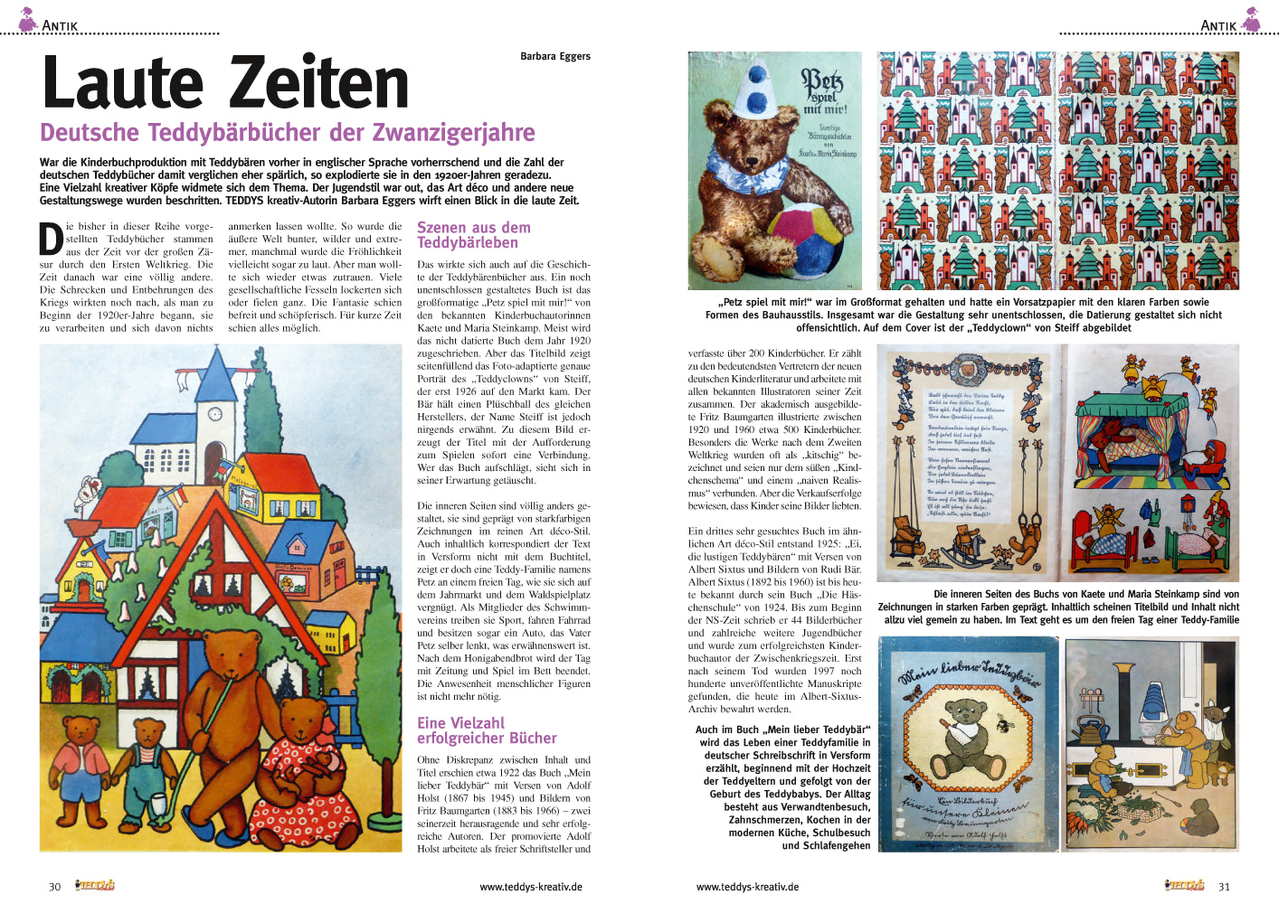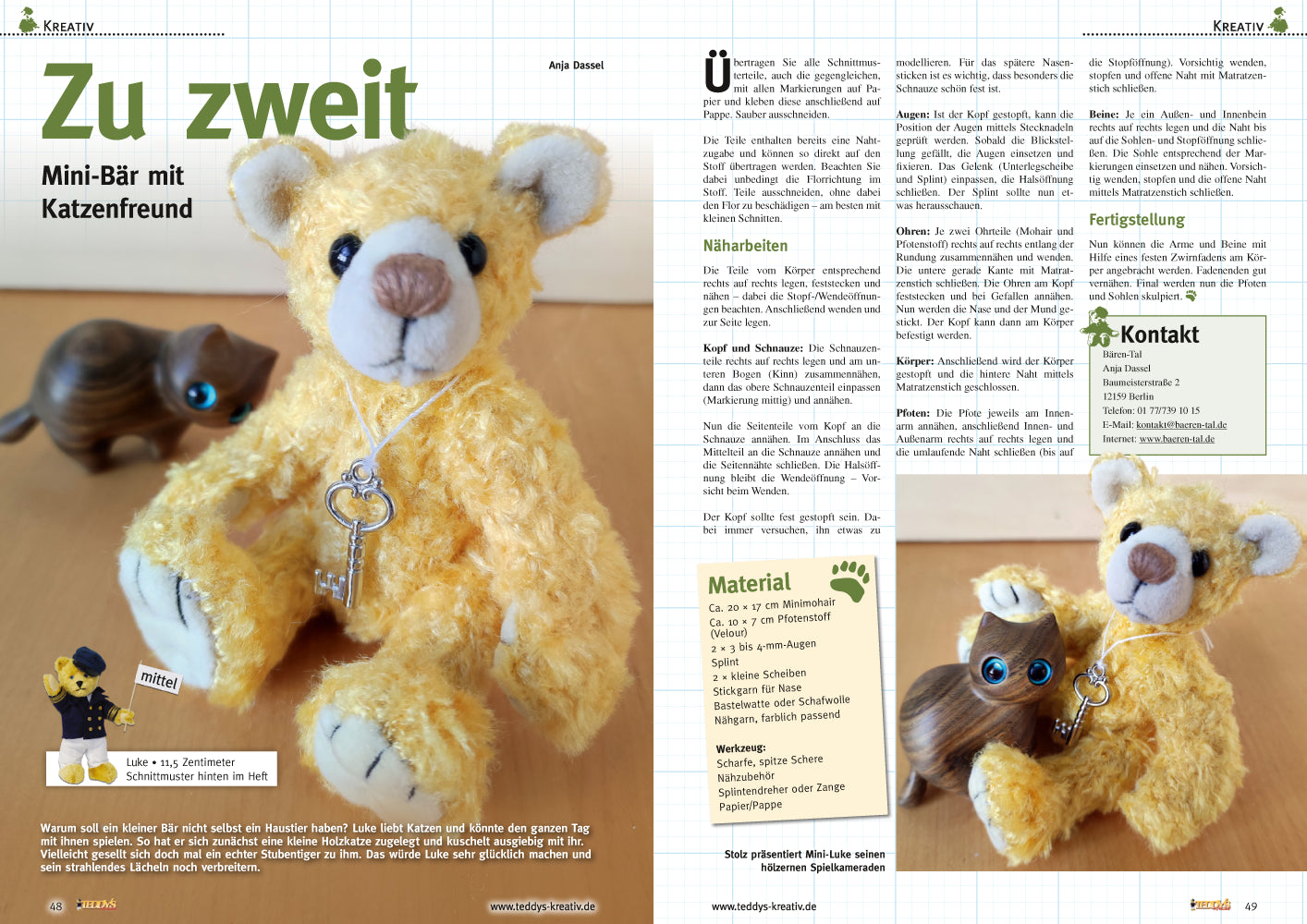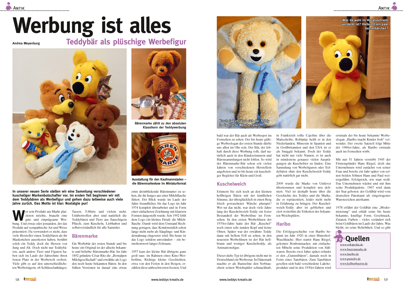 TEDDYS kreativ widmet sich allen Aspekten rund um Teddybären und Plüschtiere. Fundierte Informationen einerseits, liebenswerte Geschichten andererseits machen das Magazin zum unverzichtbaren Begleiter für Teddy-Liebhaber, -Sammler und -Künstler. Ein umfangreicher Kreativteil mit Nähanleitungen und Schnittbögen zum Nacharbeiten gehört zu jeder Ausgabe. Vervollständigt wird TEDDYS kreativ durch Profi-Tipps für Einsteiger und Fortgeschrittene sowie durch ausführliche Antik- und Auktionsberichte.