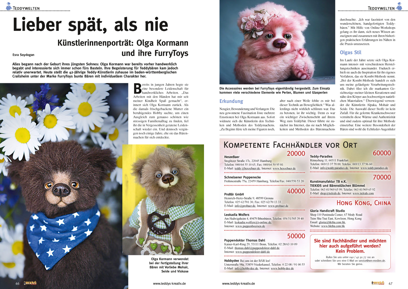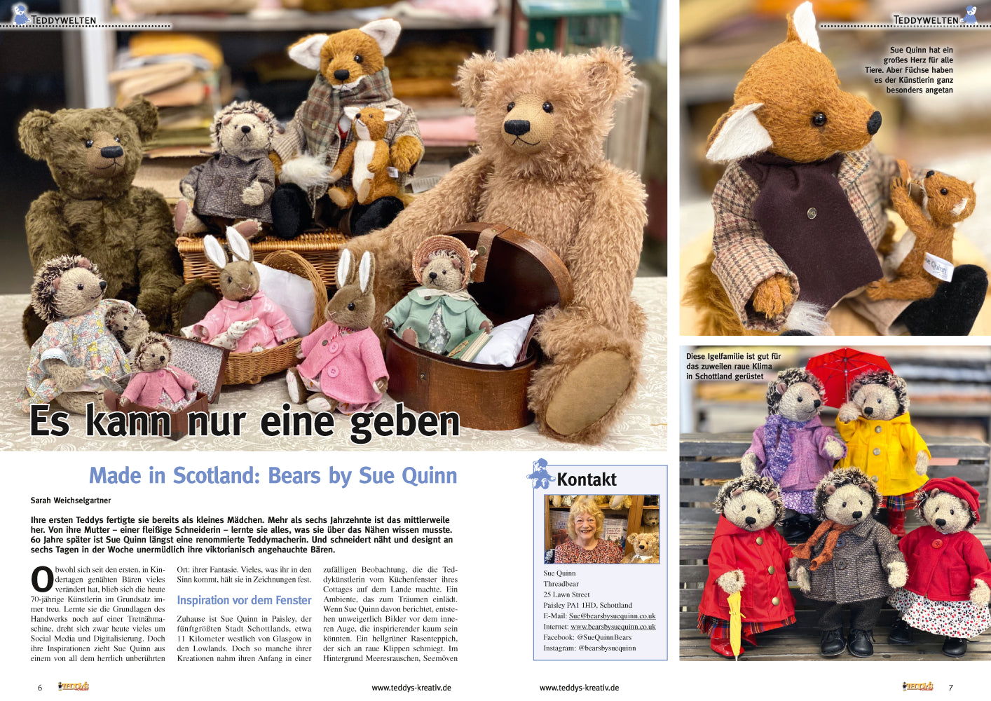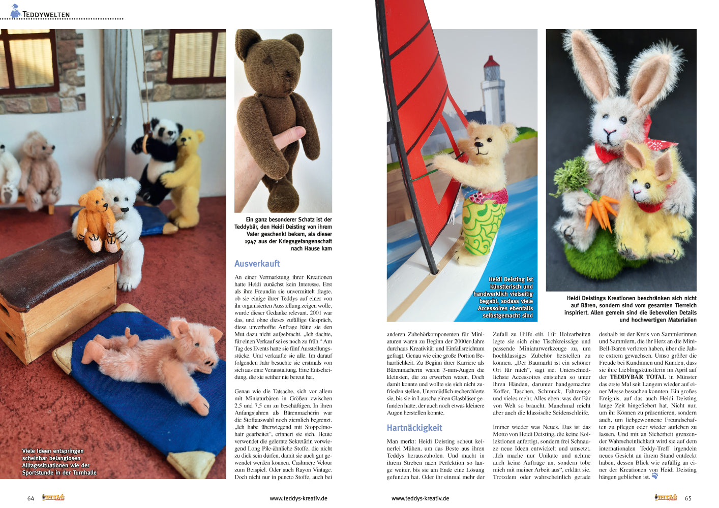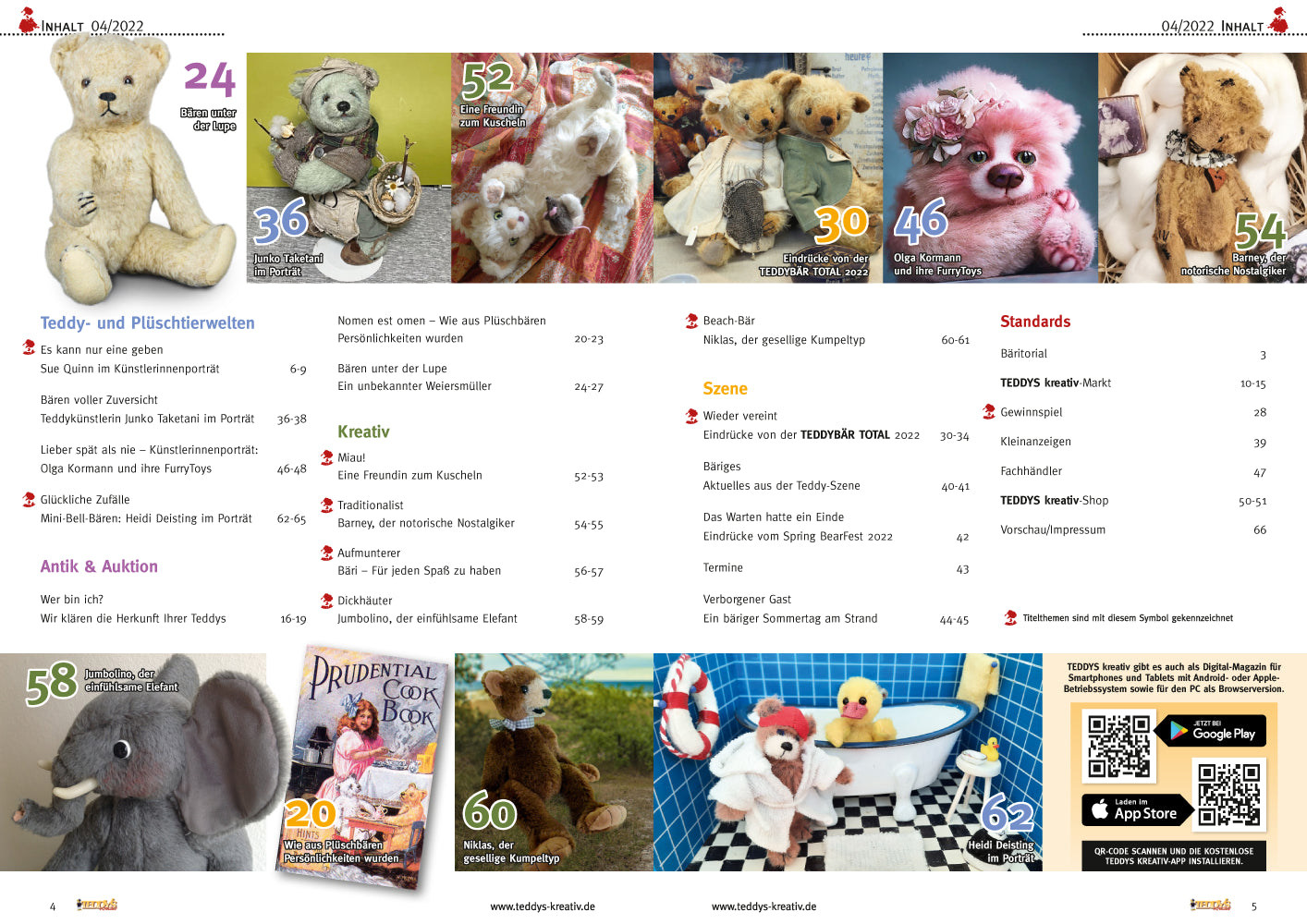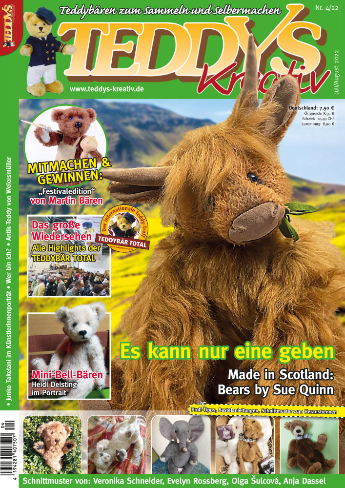 TEDDYS kreativ widmet sich allen Aspekten rund um Teddybären und Plüschtiere. Fundierte Informationen einerseits, liebenswerte Geschichten andererseits machen das Magazin zum unverzichtbaren Begleiter für Teddy-Liebhaber, -Sammler und -Künstler. Ein umfangreicher Kreativteil mit Nähanleitungen und Schnittbögen zum Nacharbeiten gehört zu jeder Ausgabe. Vervollständigt wird TEDDYS kreativ durch Profi-Tipps für Einsteiger und Fortgeschrittene sowie durch ausführliche Antik- und Auktionsberichte.