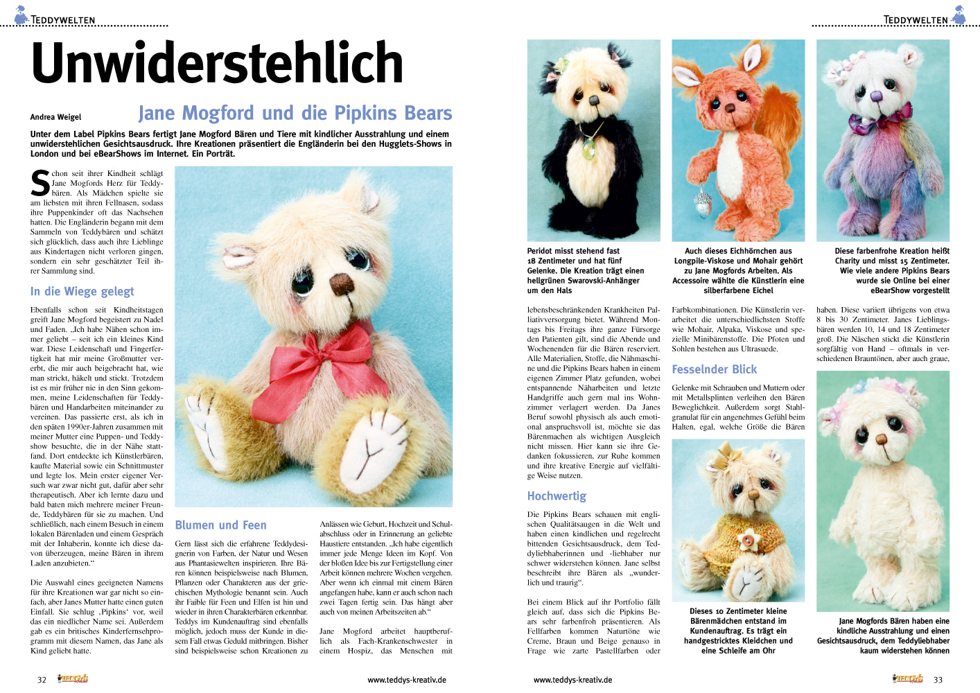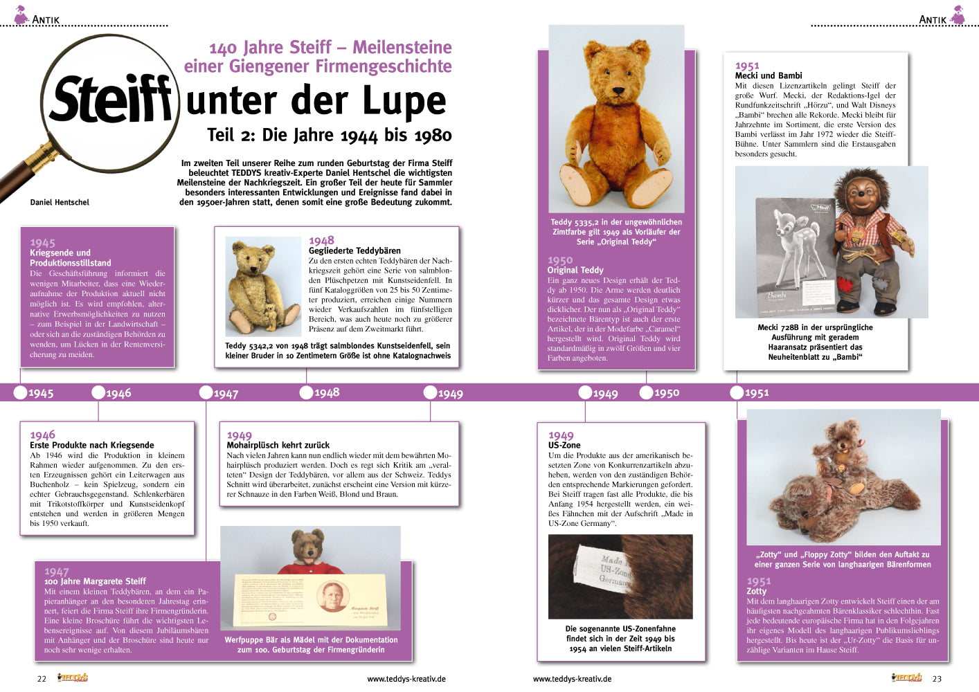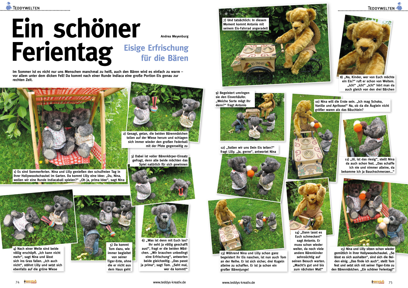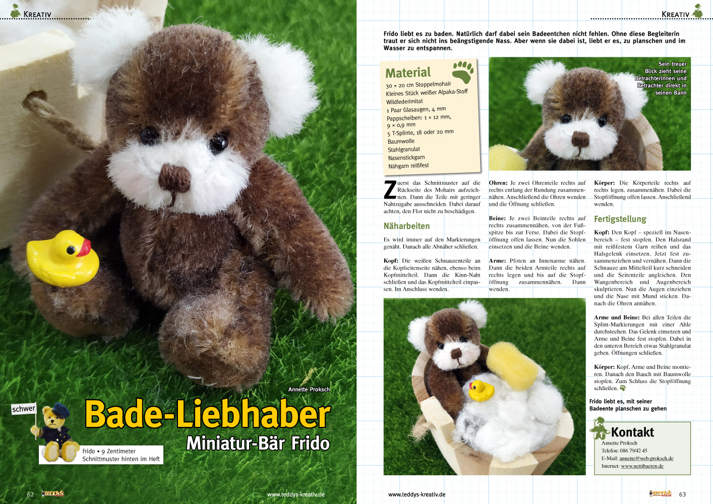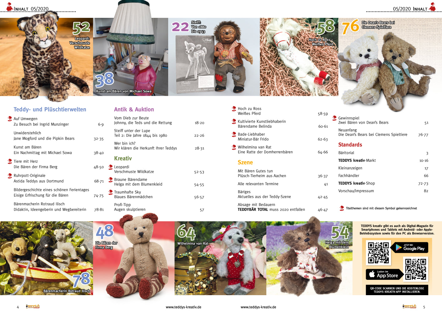 TEDDYS kreativ widmet sich allen Aspekten rund um Teddybären und Plüschtiere. Fundierte Informationen einerseits, liebenswerte Geschichten andererseits machen das Magazin zum unverzichtbaren Begleiter für Teddy-Liebhaber, -Sammler und -Künstler. Ein umfangreicher Kreativteil mit Nähanleitungen und Schnittbögen zum Nacharbeiten gehört zu jeder Ausgabe. Vervollständigt wird TEDDYS kreativ durch Profi-Tipps für Einsteiger und Fortgeschrittene sowie durch ausführliche Antik- und Auktionsberichte.