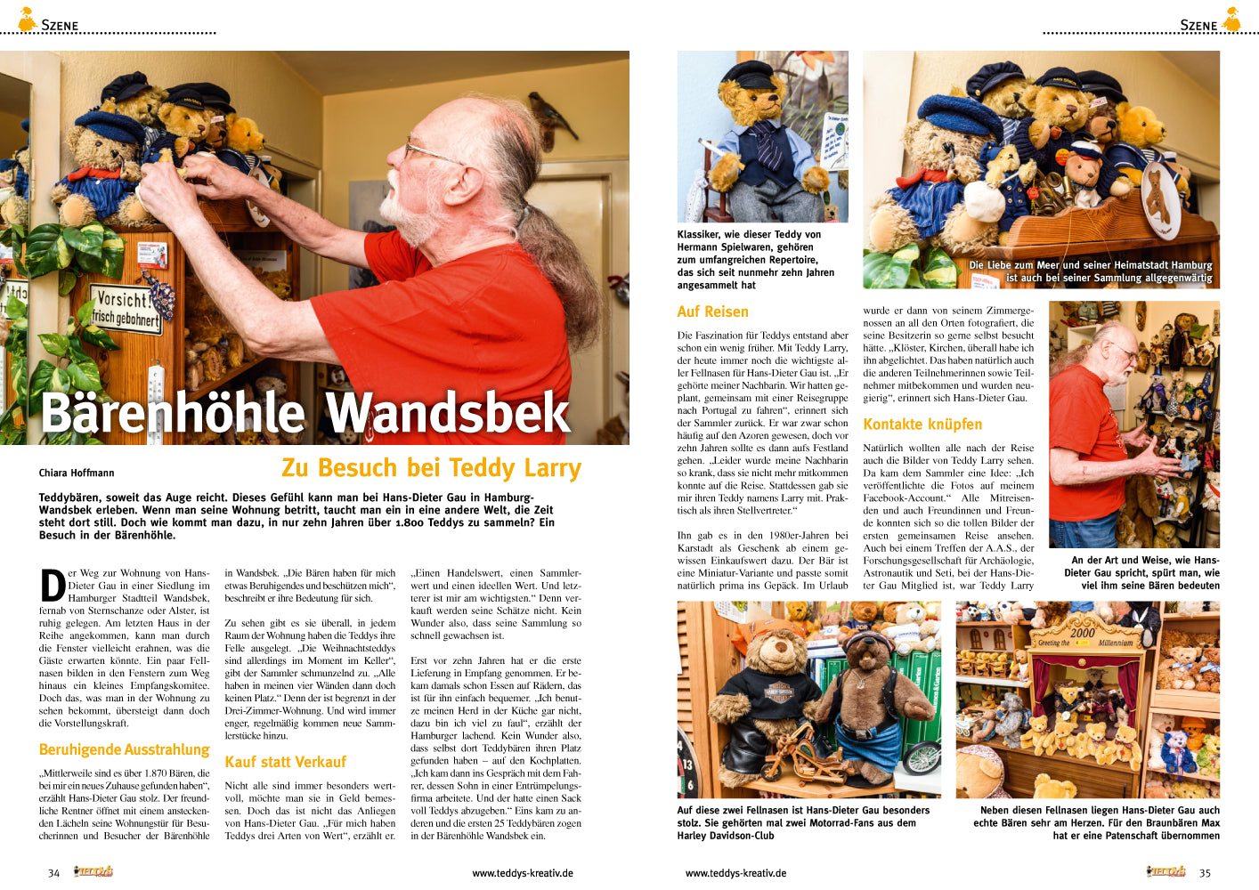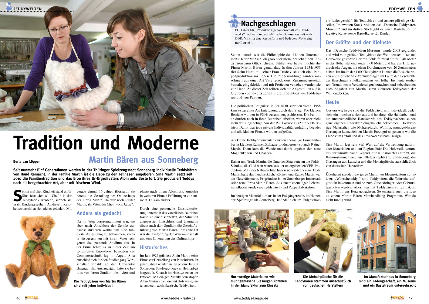 TEDDYS kreativ widmet sich allen Aspekten rund um Teddybären und Plüschtiere. Fundierte Informationen einerseits, liebenswerte Geschichten andererseits machen das Magazin zum unverzichtbaren Begleiter für Teddy-Liebhaber, -Sammler und -Künstler. Ein umfangreicher Kreativteil mit Nähanleitungen und Schnittbögen zum Nacharbeiten gehört zu jeder Ausgabe. Vervollständigt wird TEDDYS kreativ durch Profi-Tipps für Einsteiger und Fortgeschrittene sowie durch ausführliche Antik- und Auktionsberichte.