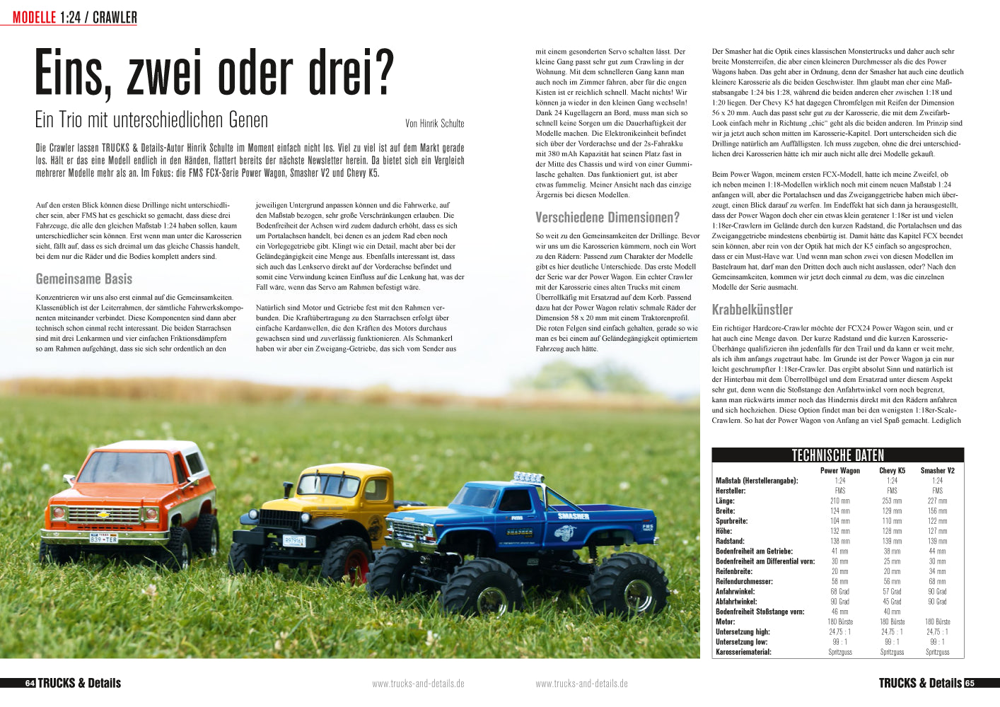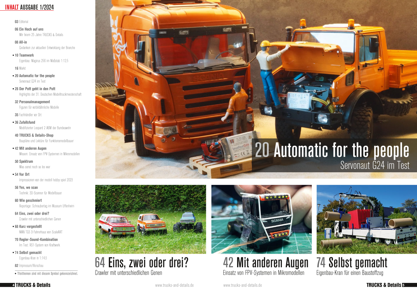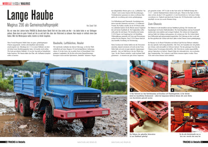 TRUCKS & Details ist die Modellbauzeitschrift für Nutzfahrzeugfreunde. Kompetent, unterhaltsam und immer nah an der Szene berichtet das Magazin über European & American Trucks, Aktuelle Fahrzeuge & Oldtimer. Dabei kommen sämtliche Maßstäbe vor, 1:8 bis 1:87. Einen großen Teil nehmen Eigenbauten ein, die zum Nachbauen animieren. Baumaschinen, Neuheiten am Markt, Elektrik & Elektronik, Materialbearbeitung und vieles mehr runden das Portfolio ab.