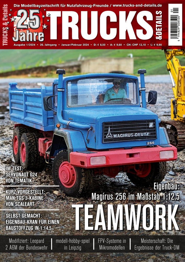 Jan Schönberg, Chefredakteur TRUCKS & Details: „Mein Ziel ist es, mit meinem Team in unserem Magazin regelmäßig alle relevanten Informationen rund um RC-Nutzfahrzeuge in bekömmlicher Form zu präsentieren – stets unabhängig und an den Wünschen unserer Leser ausgerichtet. Im Mittelpunkt stehen neben Testberichten und Informationen aus der Szene vor allem Eigenbauten. Denn TRUCKS & Details, das ist noch echter Modellbau.“