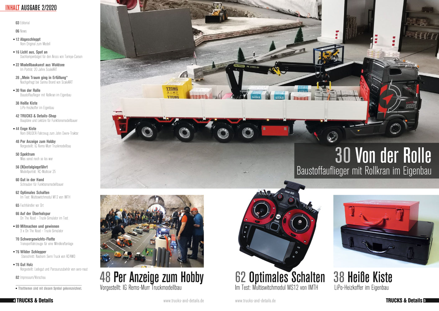 Jan Schönberg, Chefredakteur TRUCKS & Details: „Mein Ziel ist es, mit meinem Team in unserem Magazin regelmäßig alle relevanten Informationen rund um RC-Nutzfahrzeuge in bekömmlicher Form zu präsentieren – stets unabhängig und an den Wünschen unserer Leser ausgerichtet. Im Mittelpunkt stehen neben Testberichten und Informationen aus der Szene vor allem Eigenbauten. Denn TRUCKS & Details, das ist noch echter Modellbau.“