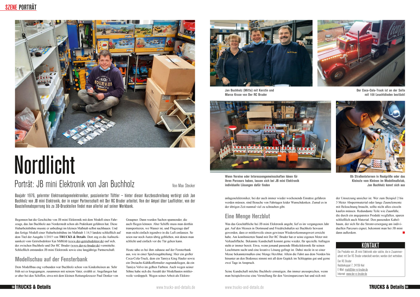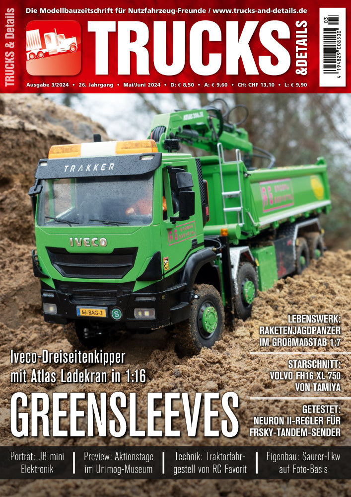 Jan Schönberg, Chefredakteur TRUCKS & Details: „Mein Ziel ist es, mit meinem Team in unserem Magazin regelmäßig alle relevanten Informationen rund um RC-Nutzfahrzeuge in bekömmlicher Form zu präsentieren – stets unabhängig und an den Wünschen unserer Leser ausgerichtet. Im Mittelpunkt stehen neben Testberichten und Informationen aus der Szene vor allem Eigenbauten. Denn TRUCKS & Details, das ist noch echter Modellbau.“
