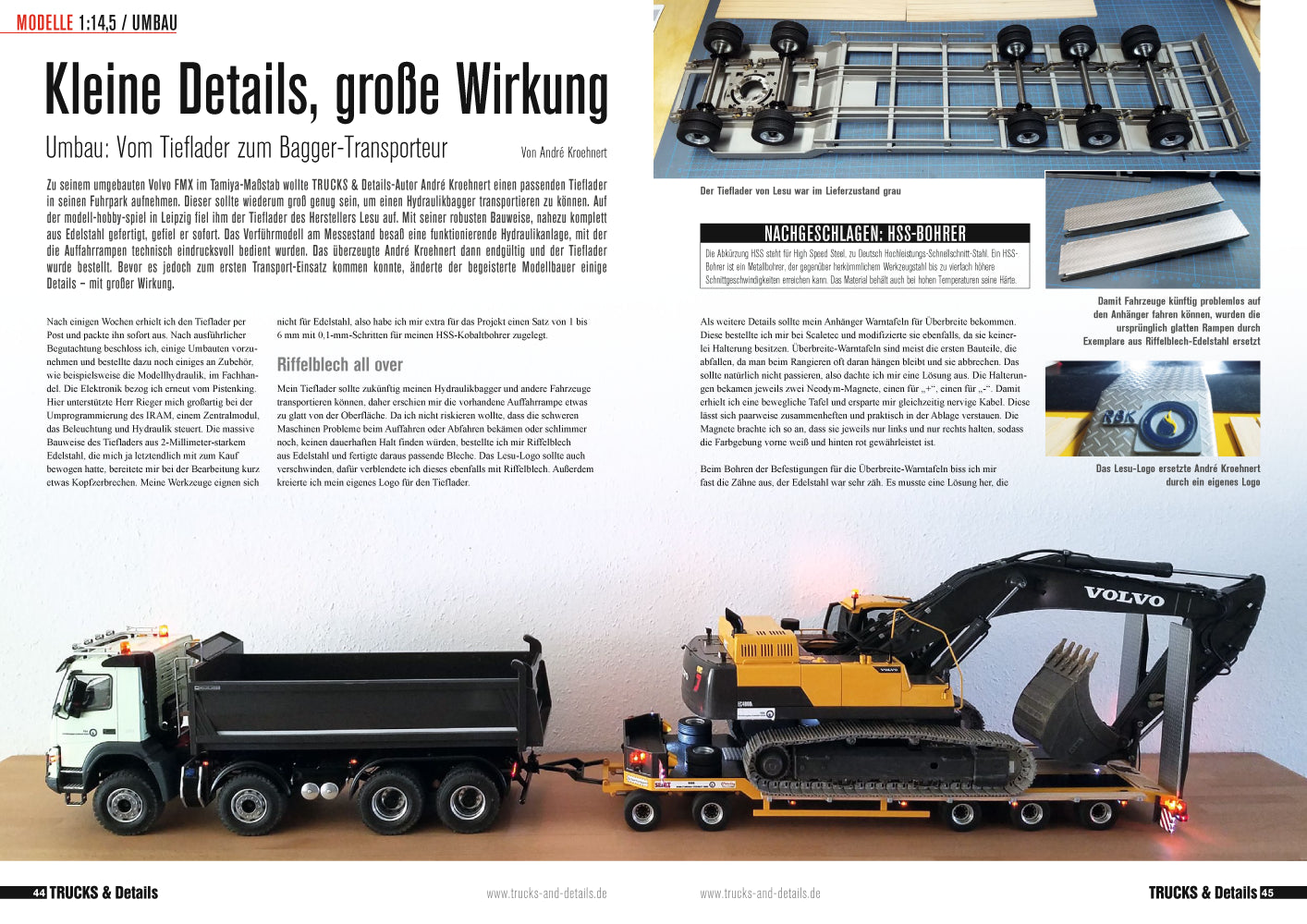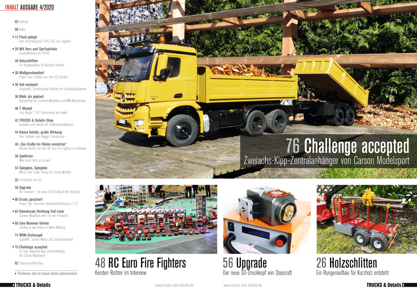 Jan Schönberg, Chefredakteur TRUCKS & Details: „Mein Ziel ist es, mit meinem Team in unserem Magazin regelmäßig alle relevanten Informationen rund um RC-Nutzfahrzeuge in bekömmlicher Form zu präsentieren – stets unabhängig und an den Wünschen unserer Leser ausgerichtet. Im Mittelpunkt stehen neben Testberichten und Informationen aus der Szene vor allem Eigenbauten. Denn TRUCKS & Details, das ist noch echter Modellbau.“
