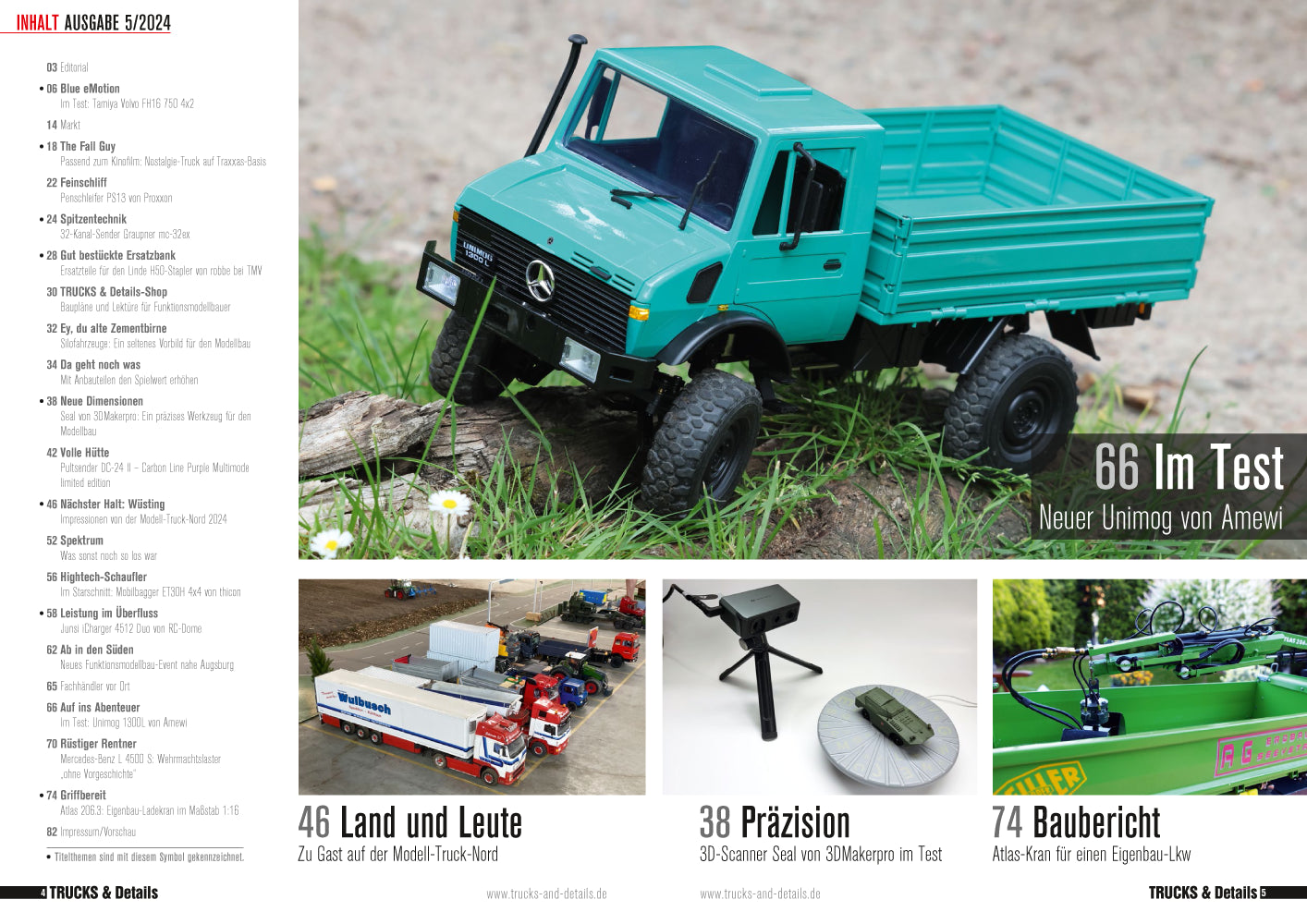 TRUCKS & Details ist die Modellbauzeitschrift für Nutzfahrzeugfreunde. Kompetent, unterhaltsam und immer nah an der Szene berichtet das Magazin über European & American Trucks, Aktuelle Fahrzeuge & Oldtimer. Dabei kommen sämtliche Maßstäbe vor, 1:8 bis 1:87. Einen großen Teil nehmen Eigenbauten ein, die zum Nachbauen animieren. Baumaschinen, Neuheiten am Markt, Elektrik & Elektronik, Materialbearbeitung und vieles mehr runden das Portfolio ab.