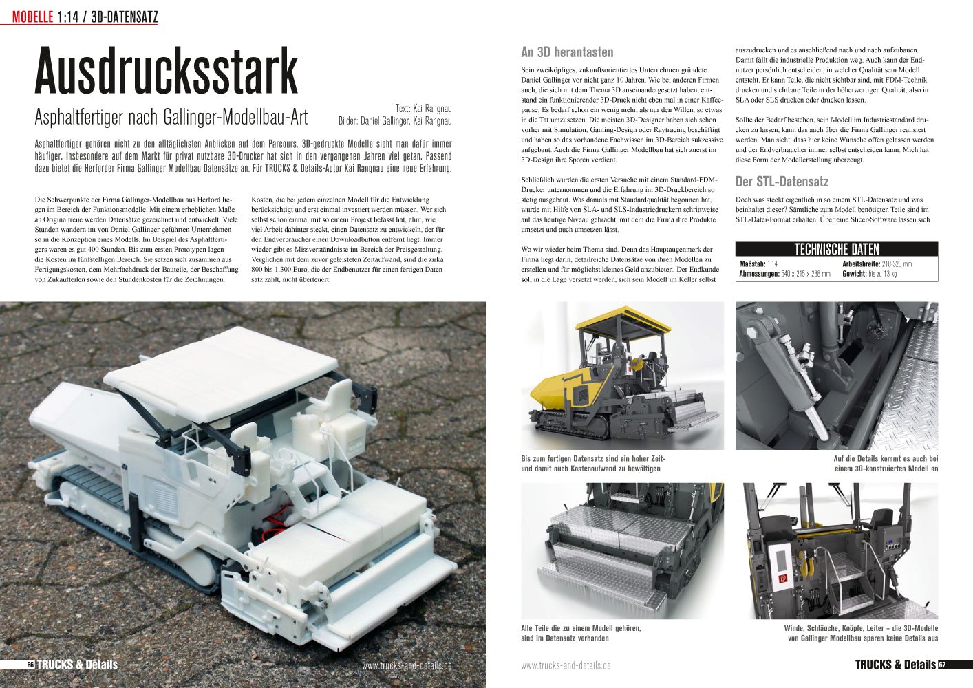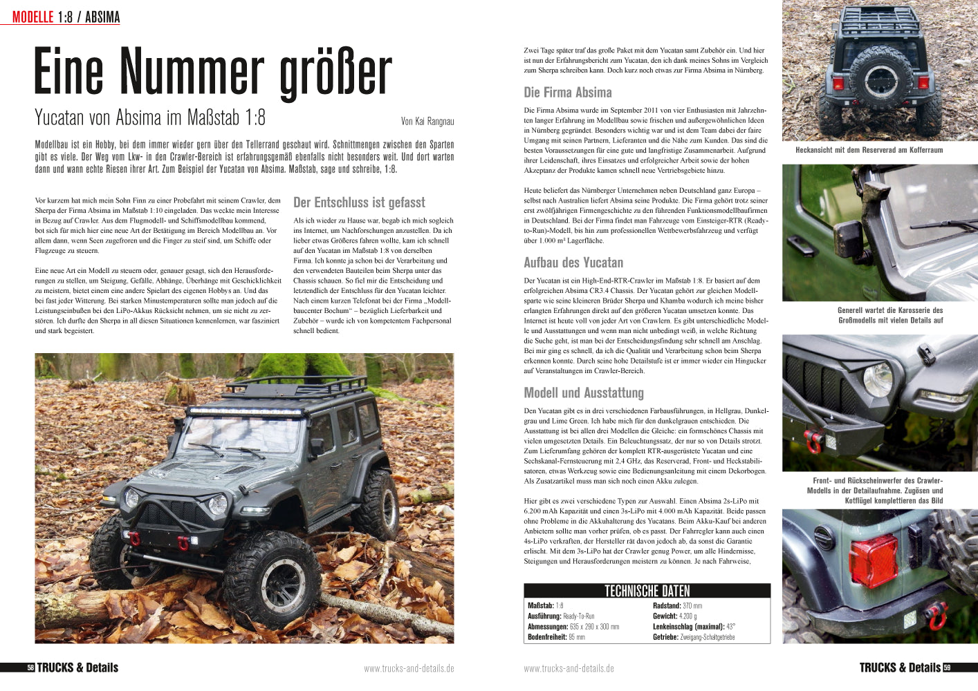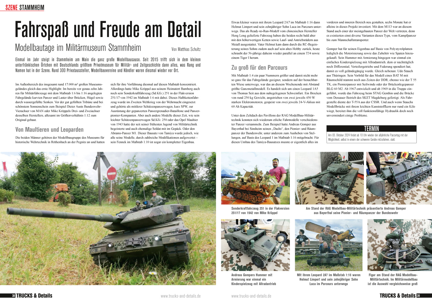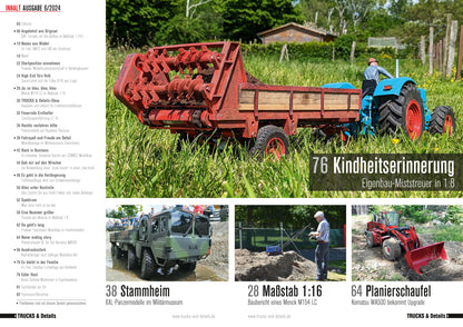 TRUCKS & Details ist die Modellbauzeitschrift für Nutzfahrzeugfreunde. Kompetent, unterhaltsam und immer nah an der Szene berichtet das Magazin über European & American Trucks, Aktuelle Fahrzeuge & Oldtimer. Dabei kommen sämtliche Maßstäbe vor, 1:8 bis 1:87. Einen großen Teil nehmen Eigenbauten ein, die zum Nachbauen animieren. Baumaschinen, Neuheiten am Markt, Elektrik & Elektronik, Materialbearbeitung und vieles mehr runden das Portfolio ab.