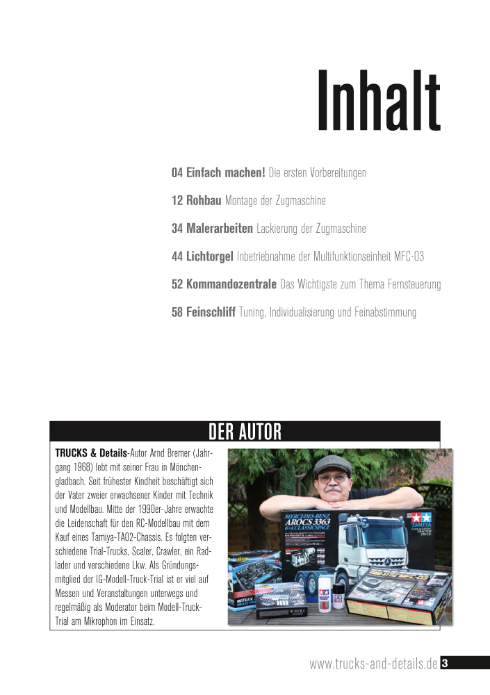 Der Funktionsmodellbau fasziniert viele Menschen. Doch genauso groß wie die Begeisterung ist oft auch der Respekt vor der technischen Herausforderung. Einsteiger werden von Eindrücken und Informationen fast erschlagen und so vielfach auch abgeschreckt. Doch das ist ebenso schade wie überflüssig, denn der Start in ein neues, faszinierendes Hobby ist weit weniger schwer als mancherorts gedacht. Mit dem TRUCKS & Details Einsteiger Workbook von Arnd Bremer erhalten Interessierte einen praxisnahen Ratgeber für die ersten Schritte auf dem Weg zum ersten selbstgebauten Modell. Im Einsteiger Workbook aus der TRUCKS & Details-Redaktion erhalten die Leser neben nutzwertigen Tipps aus der Baupraxis auch viele praktische Hinweise zur Installation der Elektrik und zum Einstellen der Licht- und Soundeffekte.