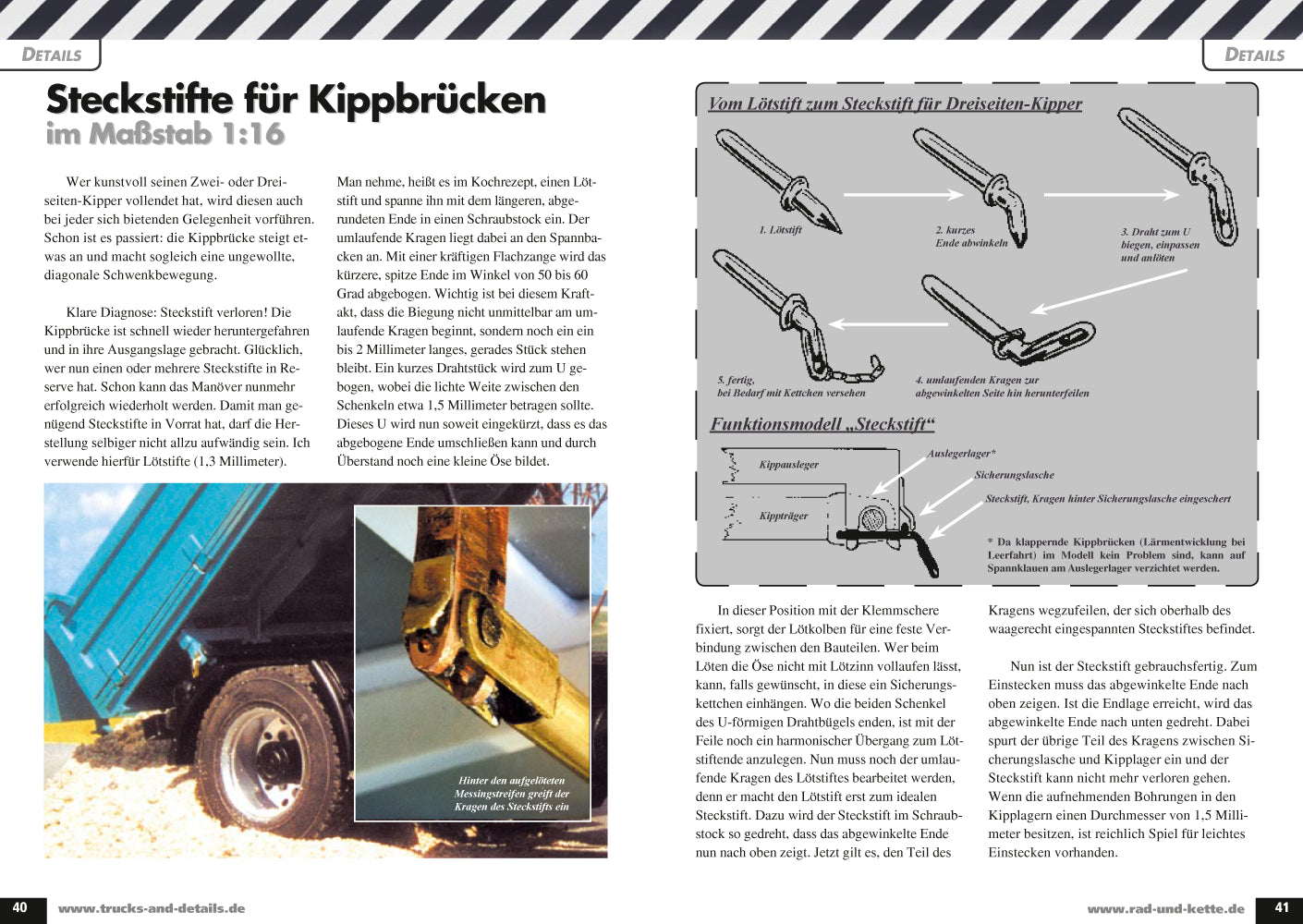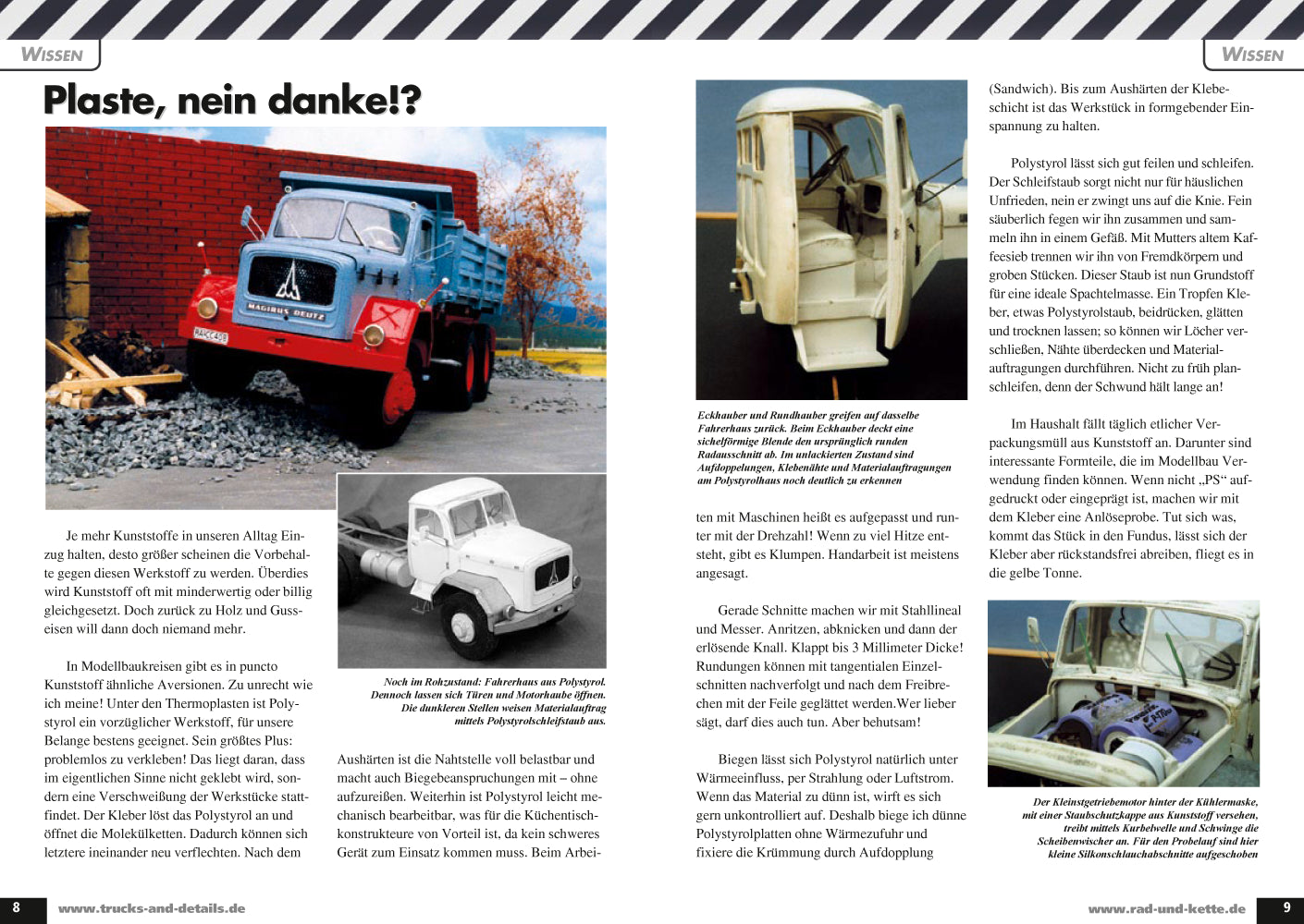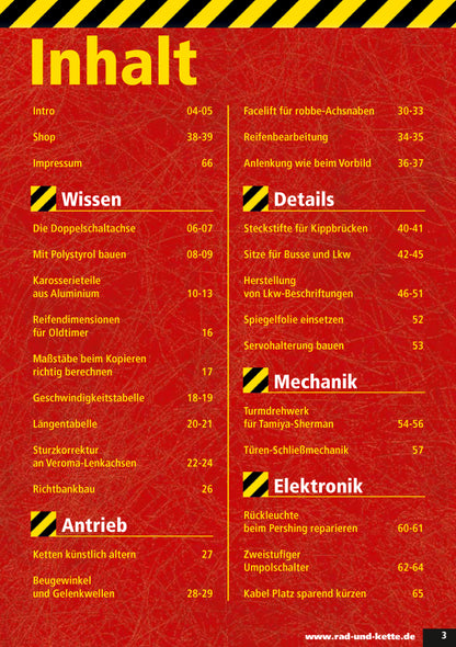 Die Beiträge sind in die Hauptthemen Wissen, Antrieb, Details, Elektronik und Mechanik sortiert und dadurch schnell auffindbar. Egal, ob Unterstützung bei der Herstellung eines originalgetreuen Reifenprofils gebraucht wird, eine Karosserie aus Alu erstellt werden soll oder die optimale Ausnutzung des geringen Platzangebots zählt - im Werkstatt-Handbuch finden Sie zu allen wichtigen Themen im Nutzfahrzeug- und Militärmodellbau hilfreiche und leicht nachvollziehbare Ratschläge.